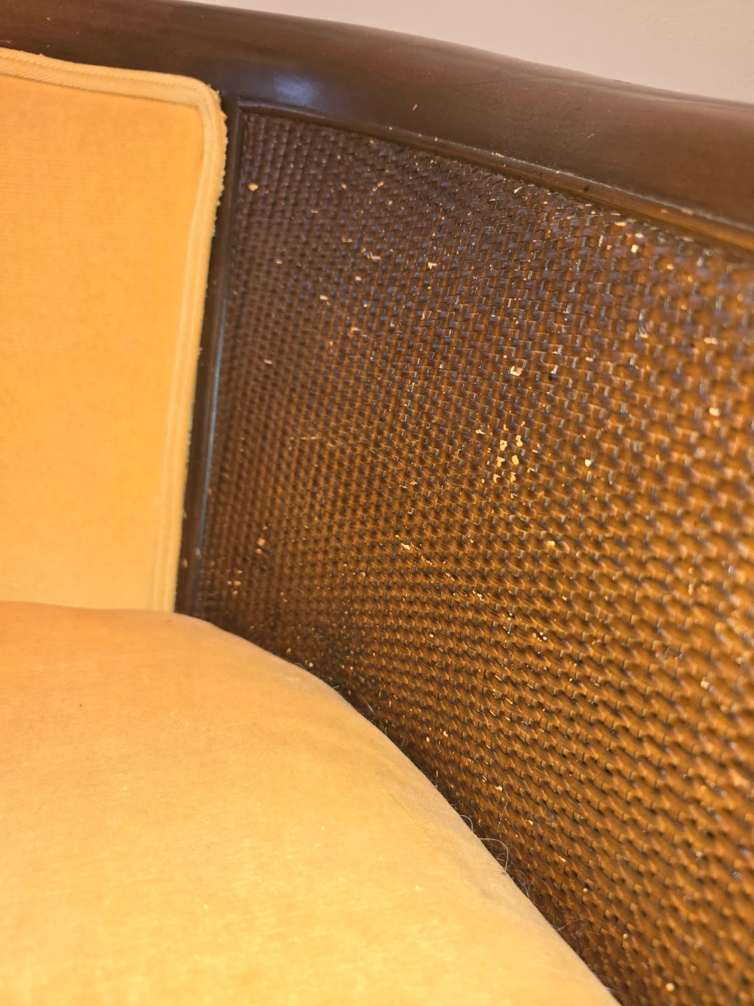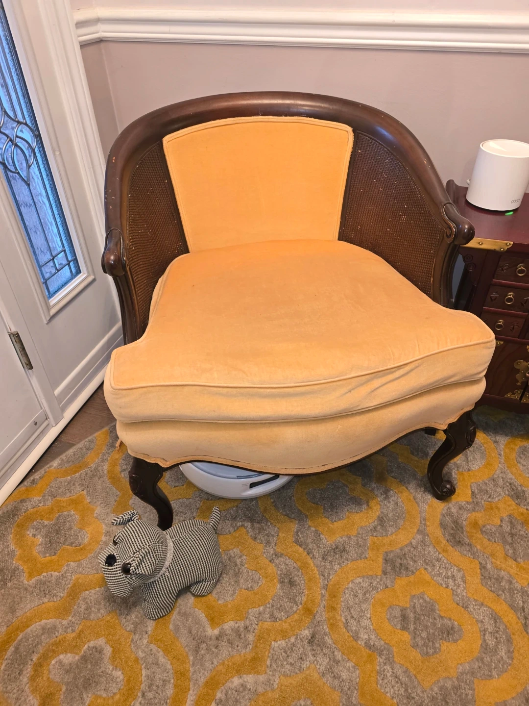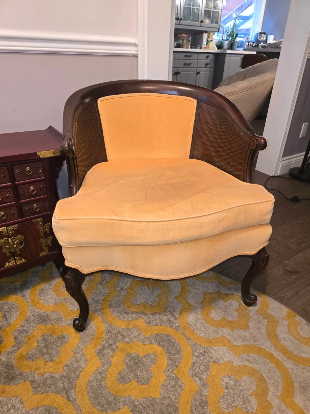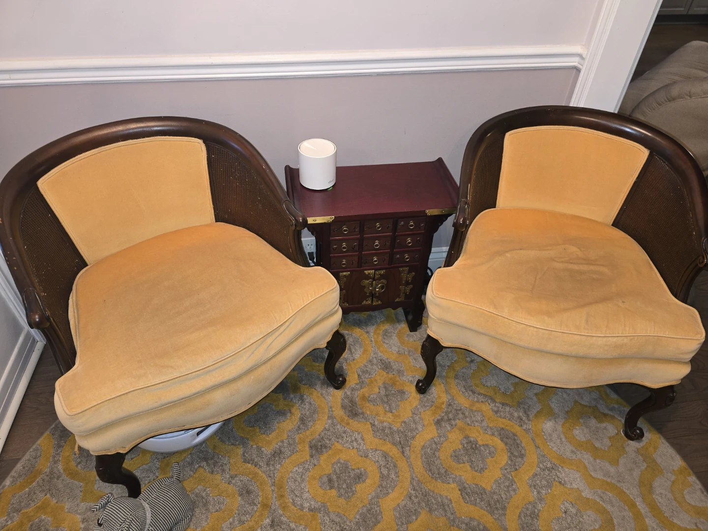Selling a set of two vintage accent chairs. They have a unique design with a wooden frame and yellow upholstery. They would look great in any living room or bedroom!