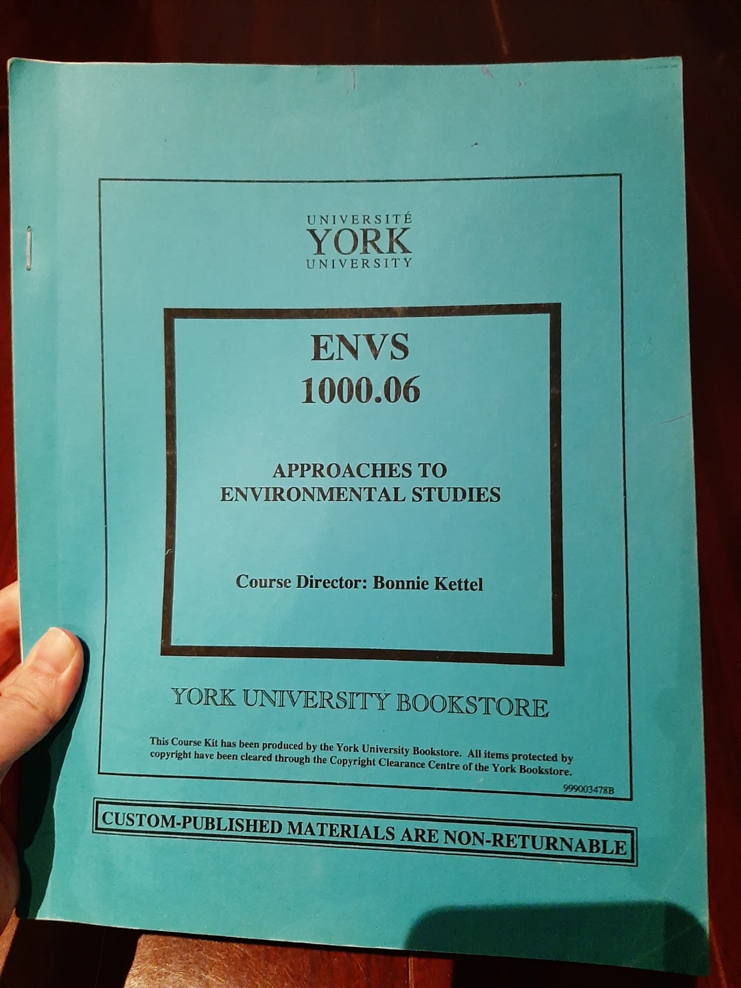Selling a York University ENVS 1000.06 Course Kit for Approaches to Environmental Studies. The course director is Bonnie Kettel. Originally priced at $21.95 from the York University Bookstore. Has highlighting so discounted.