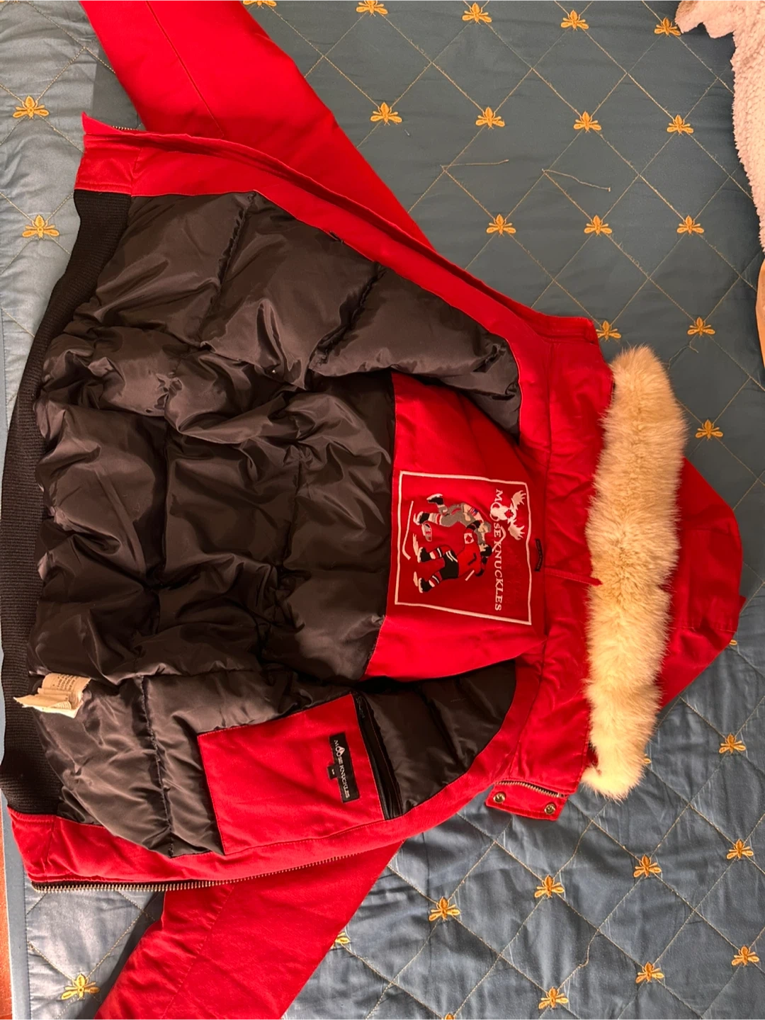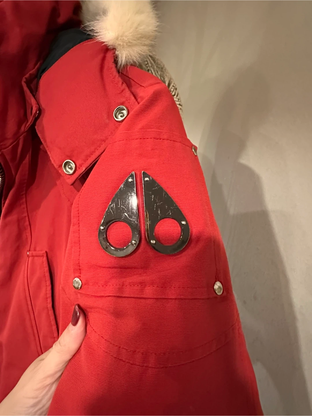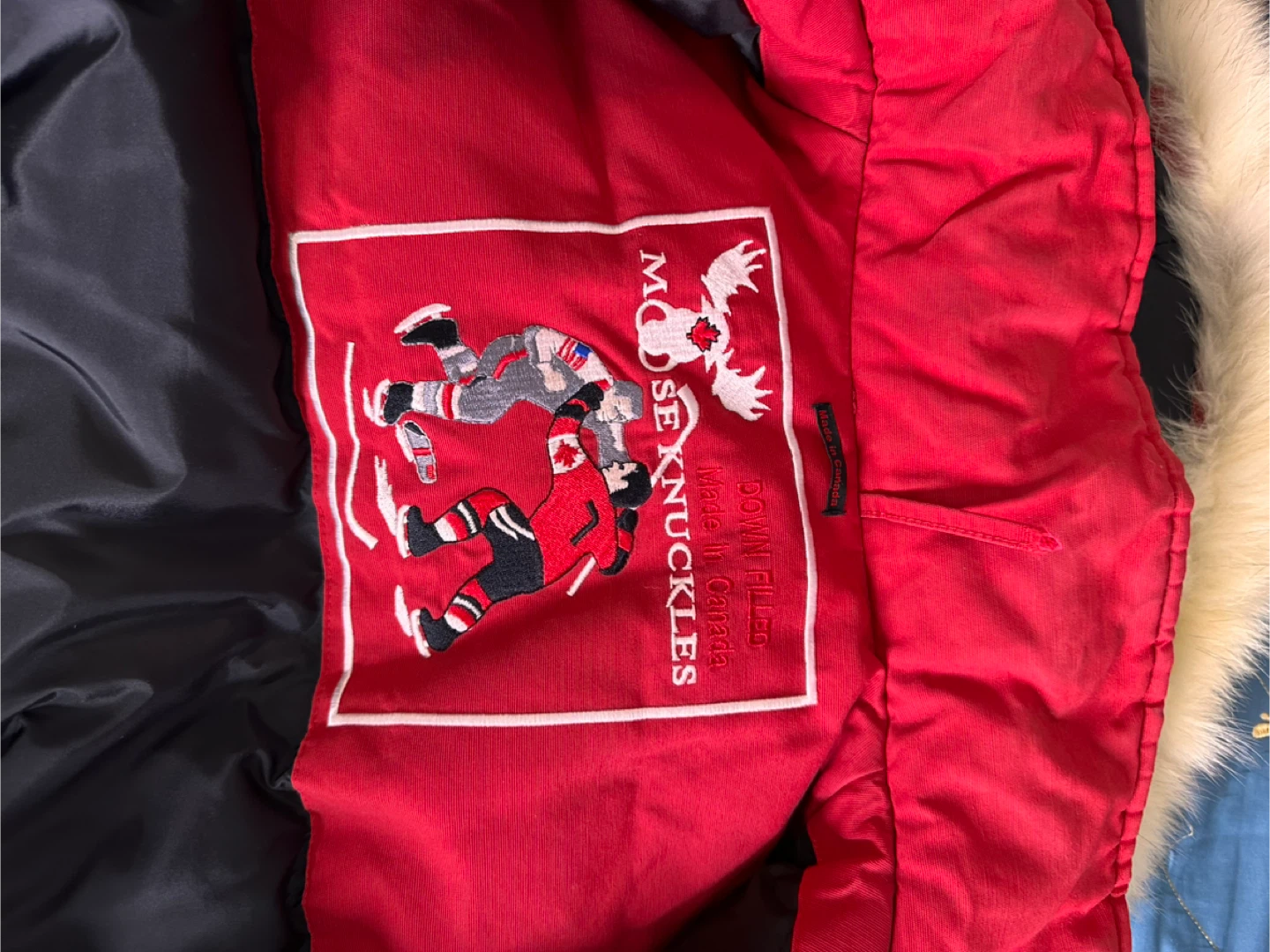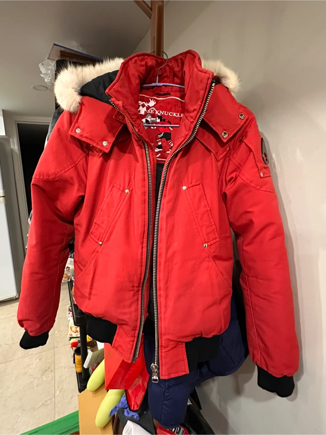 Selling a red Moose Knuckles bomber jacket! It's in great condition and has a stylish design with the iconic Moose Knuckles logo on the sleeve. The jacket features a fur-trimmed hood and a durable zipper. Perfect for staying warm and fashionable during the colder months!