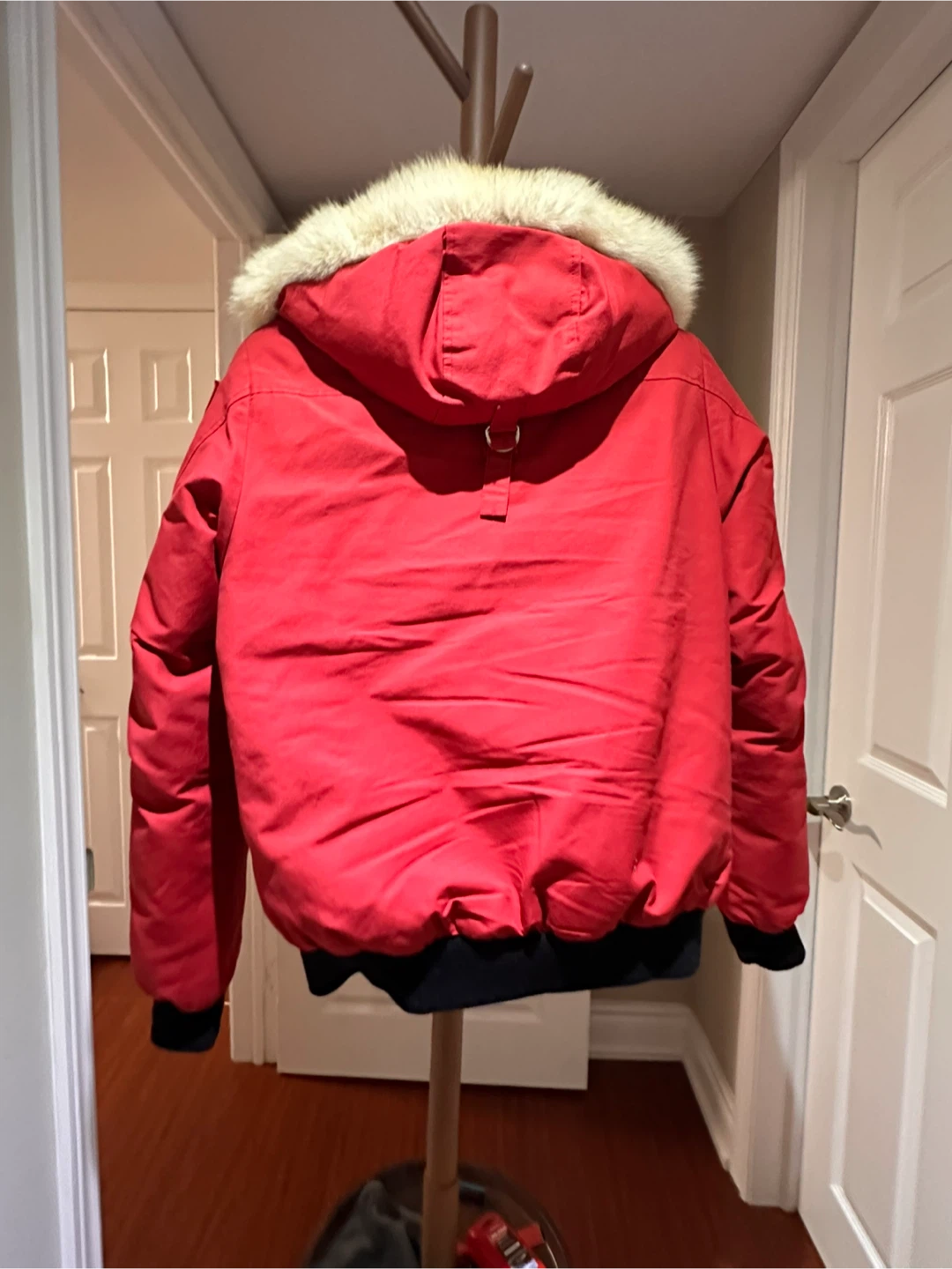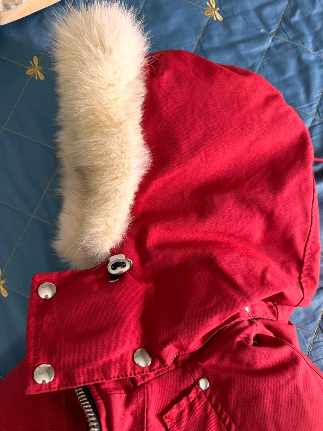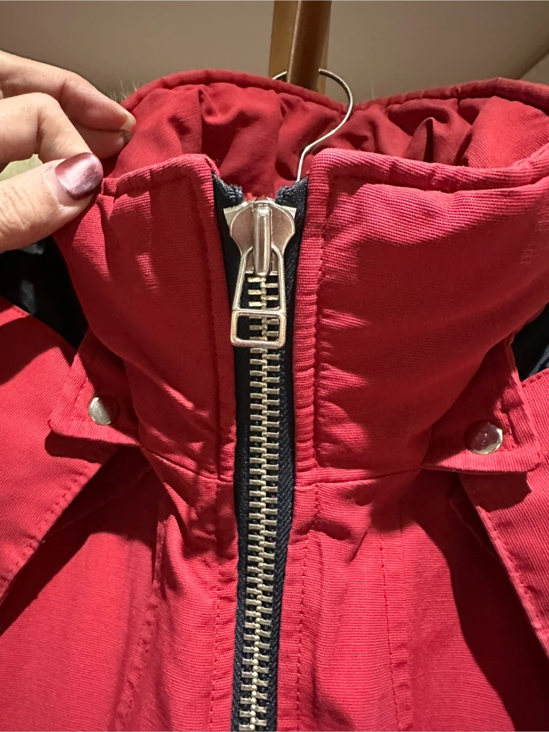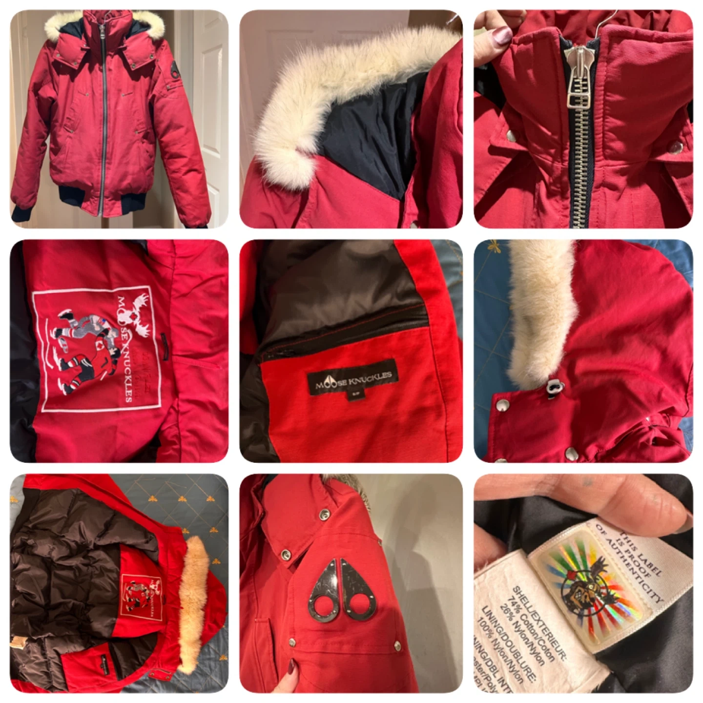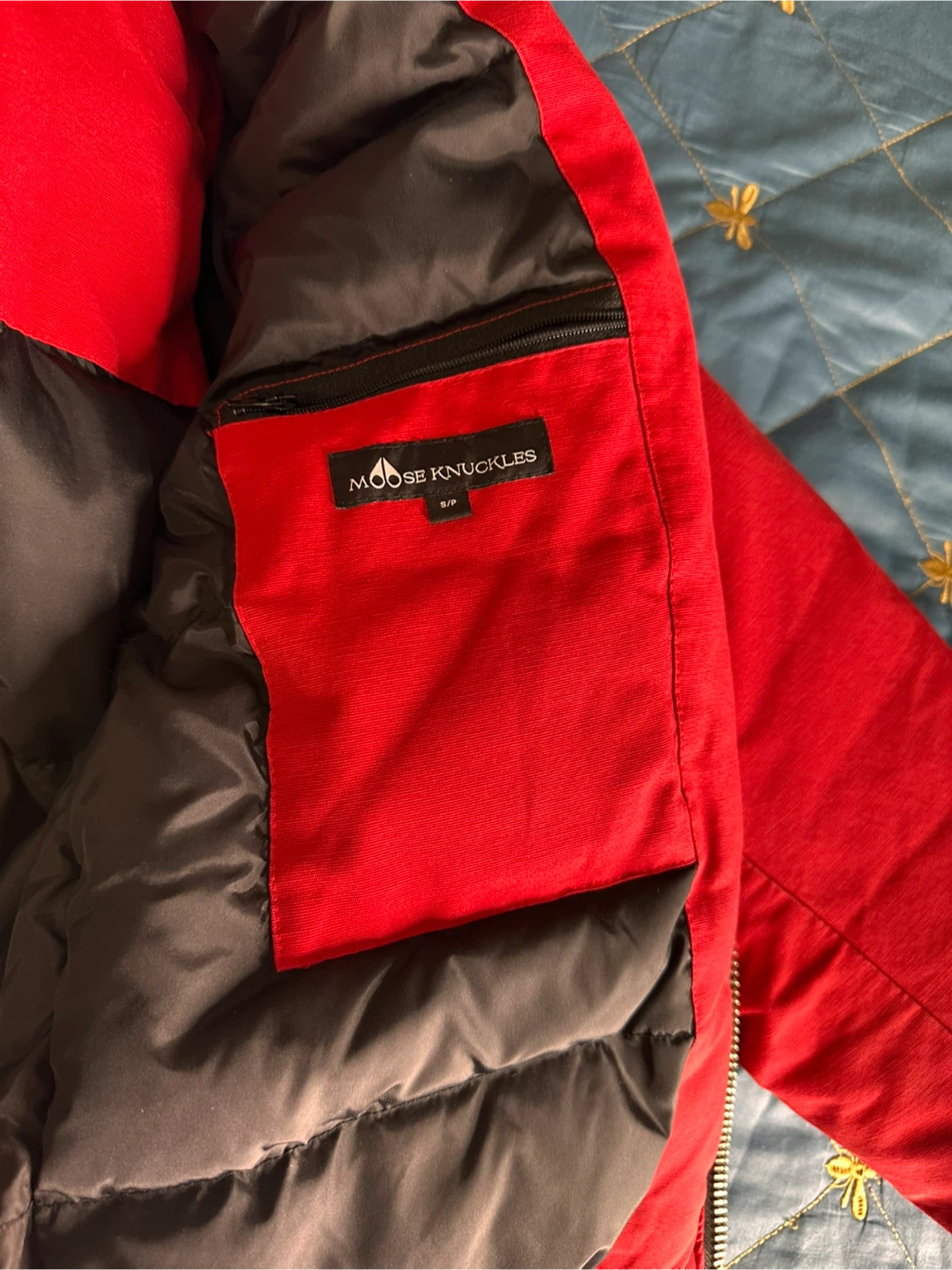 Selling a red Moose Knuckles bomber jacket! It's in great condition and has a stylish design with the iconic Moose Knuckles logo on the sleeve. The jacket features a fur-trimmed hood and a durable zipper. Perfect for staying warm and fashionable during the colder months!