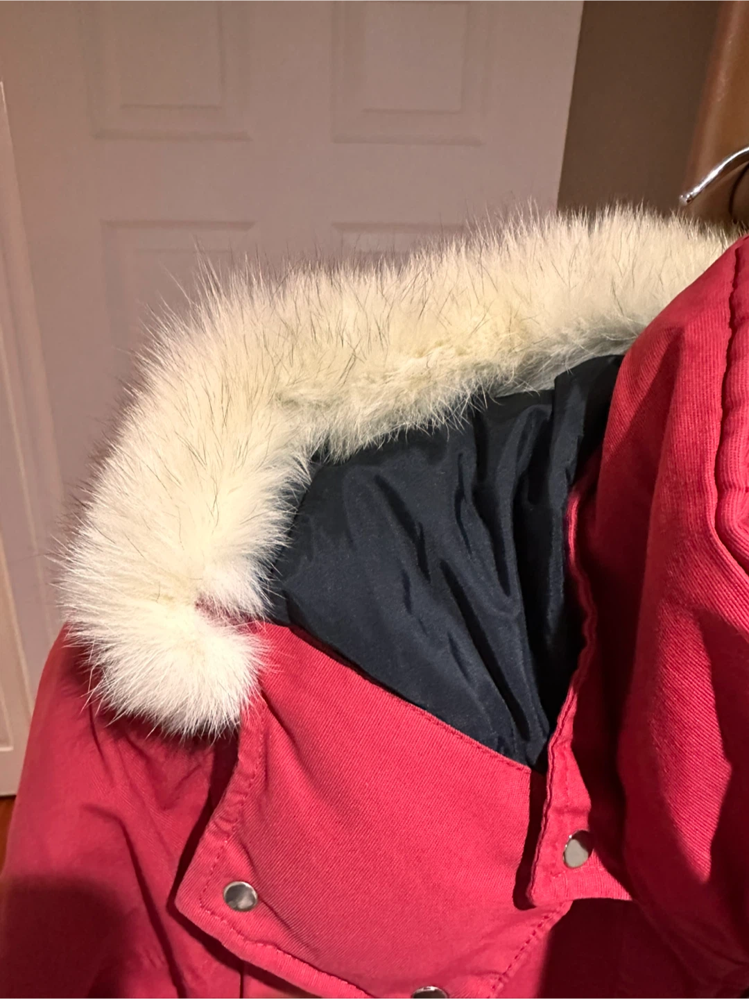 Down-filled. Features a faux fur-trimmed hood and ribbed cuffs. Made in Canada. Size small.