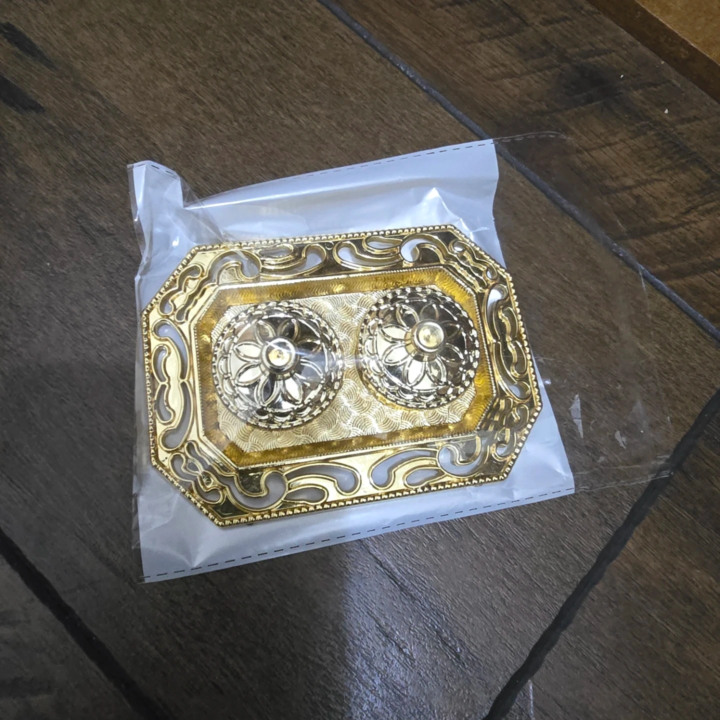 Brand new decorative gold tray, still sealed in its original packaging! It features an ornate design with two circular indentations, perfect for adding a touch of elegance to your space