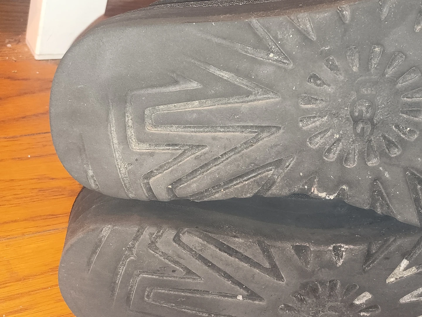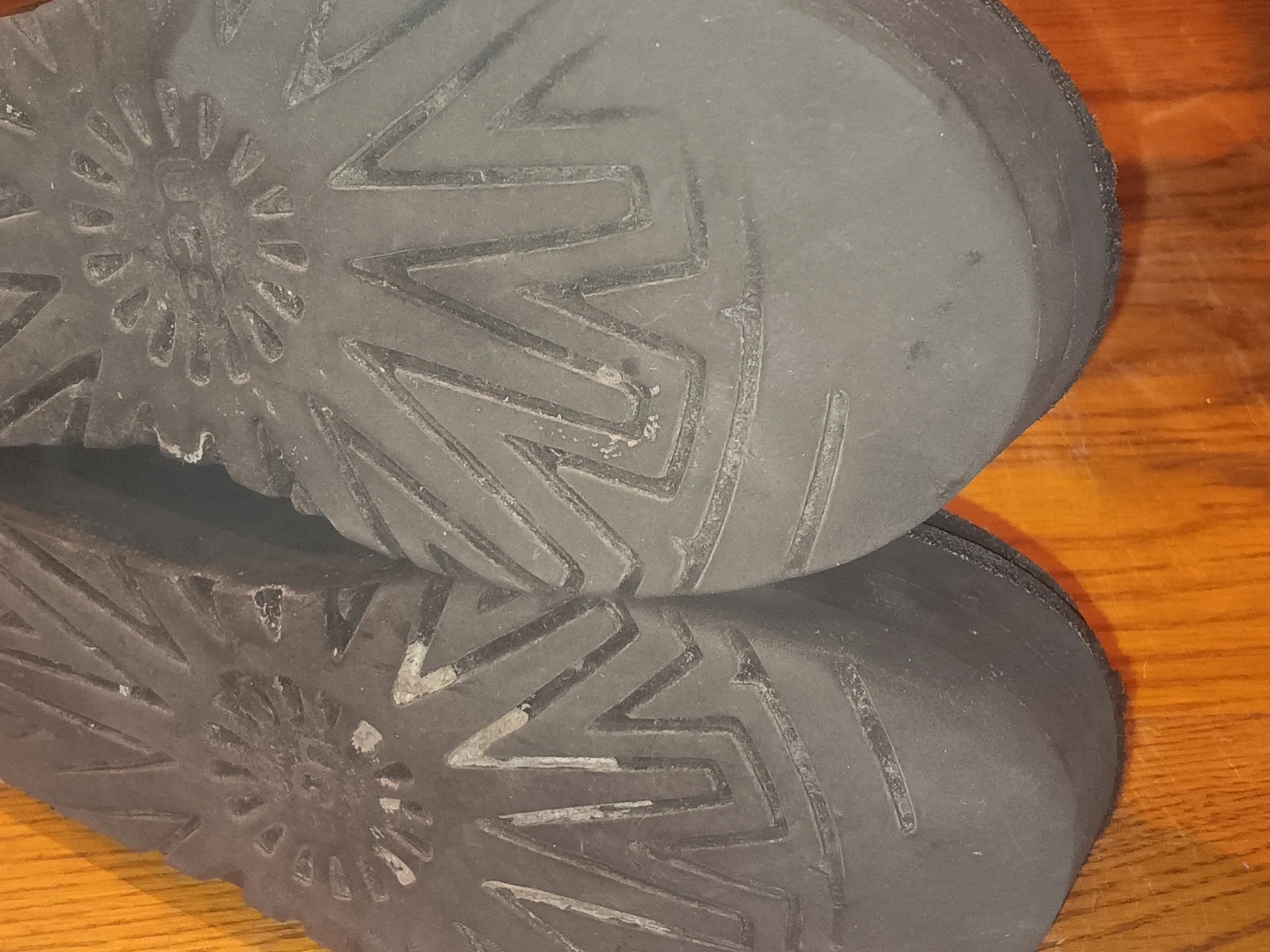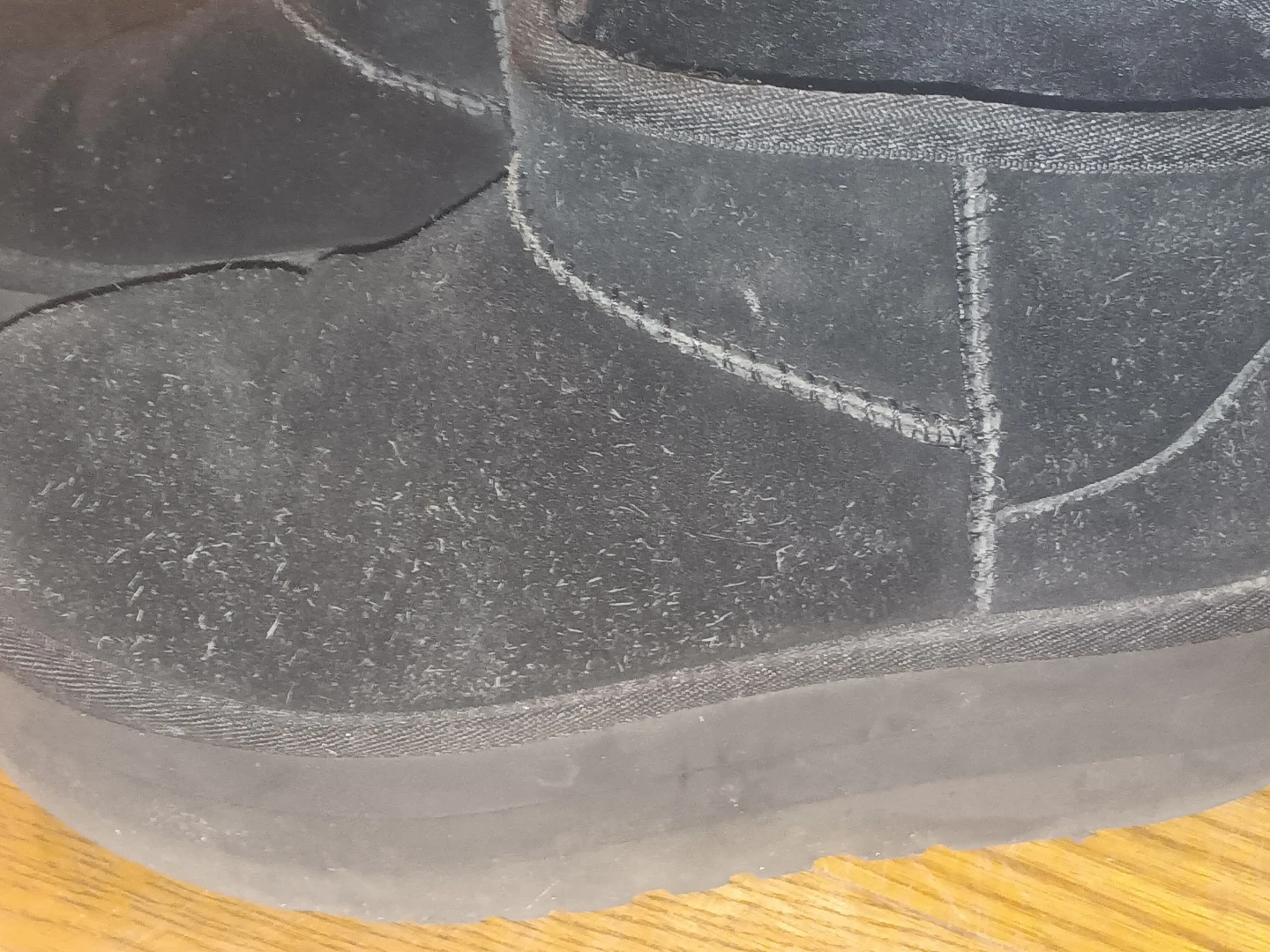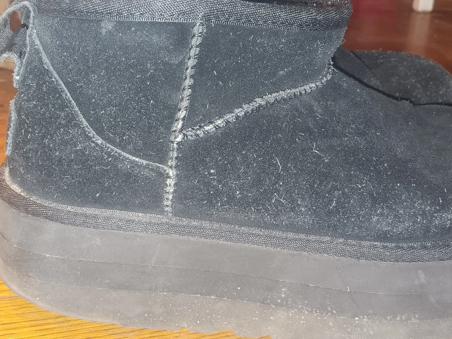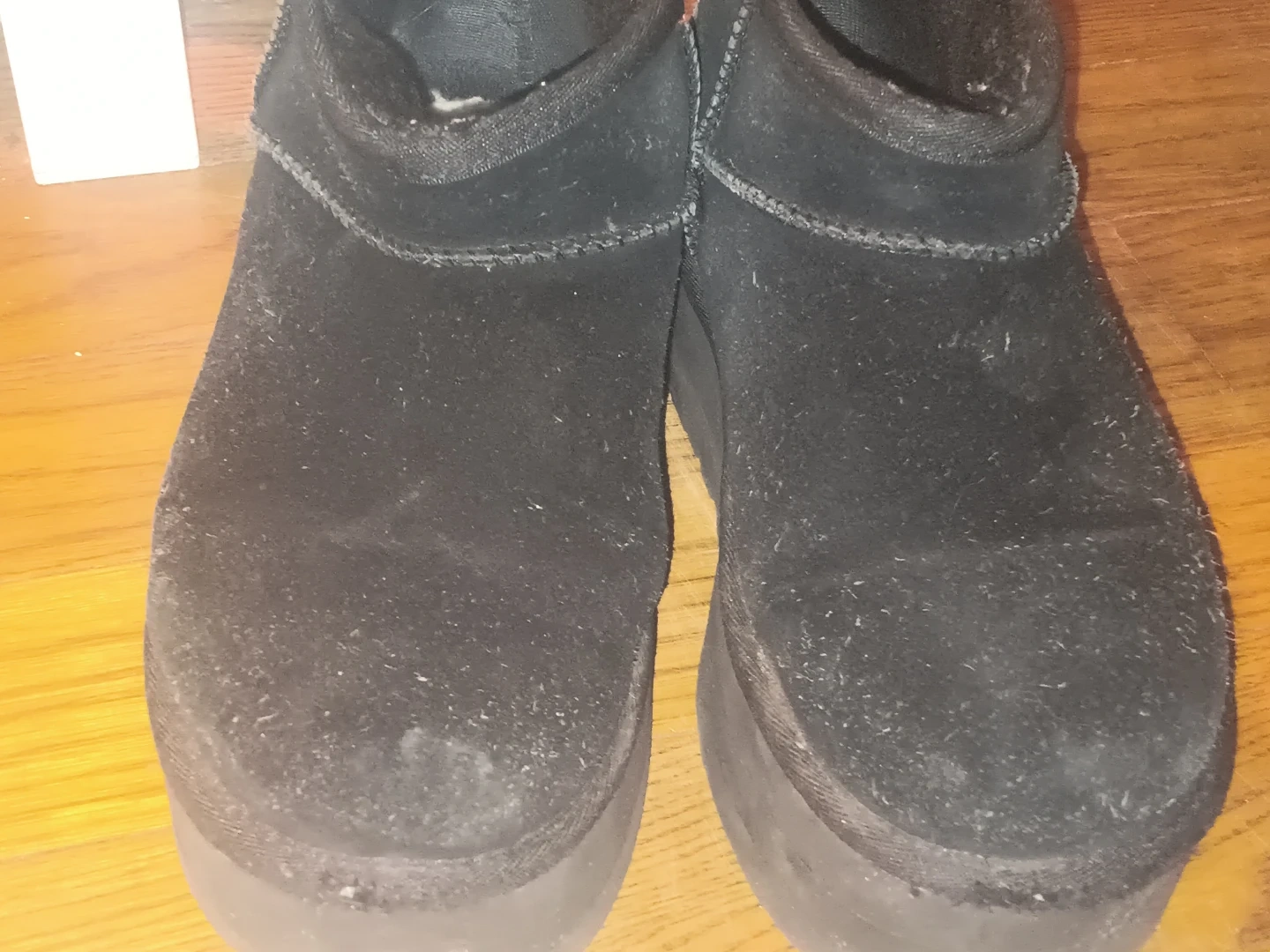 Selling a pair of UGG boots in black suede. They show signs of wear, as seen in the photos. They are perfect for keeping your feet warm and stylish during the colder months!