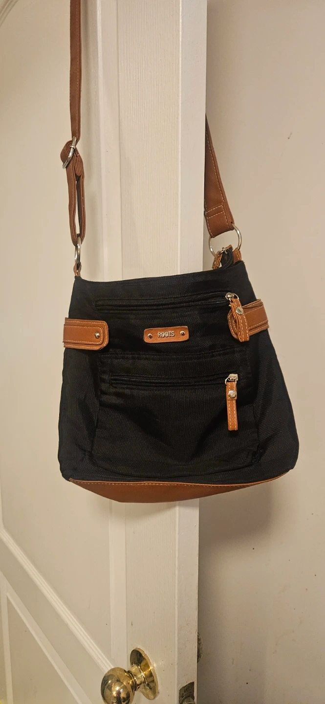 Here's a stylish black Roots crossbody bag! It has a brown trim and is in great condition. Perfect for carrying your essentials while keeping your hands free