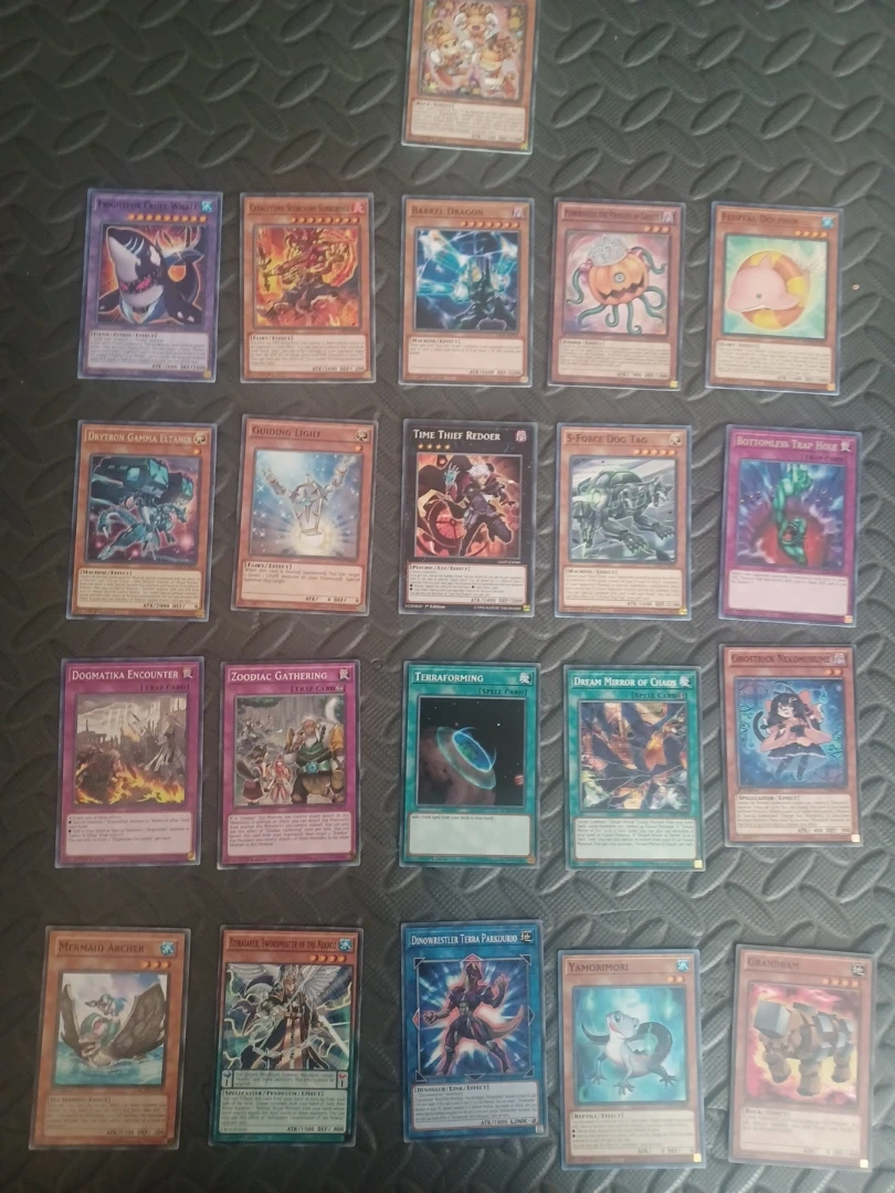 Selling a collection of Yu-Gi-Oh! trading cards. Includes cards like Barrel Dragon, Guiding Light, Time Thief Redoer, and S-Force Dog Tag. Also features Drytron Gamma Eltanin, Bottomless Trap Hole, Dogmatika Encounter, and Zoodiac Gathering. Other cards include Terraforming, Dream Mirror of Chaos, Mermaid Archer, Zefraikaner, Dinowrestler Terra Parkourio, Yamorimori, and Grandram