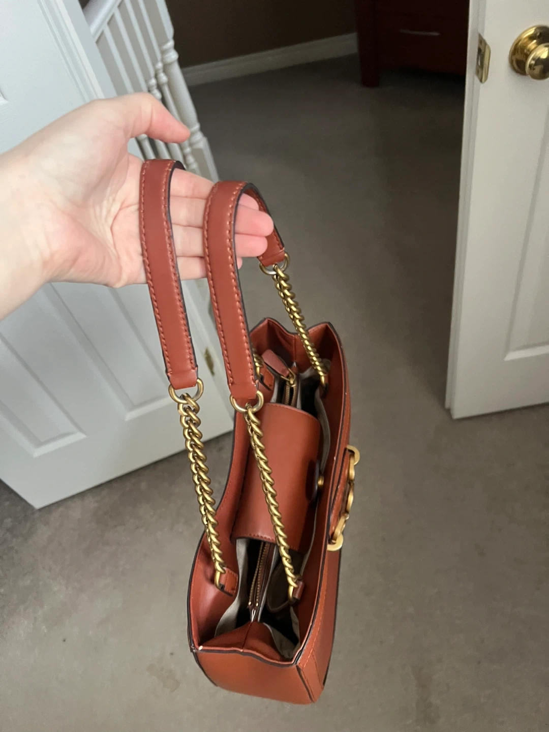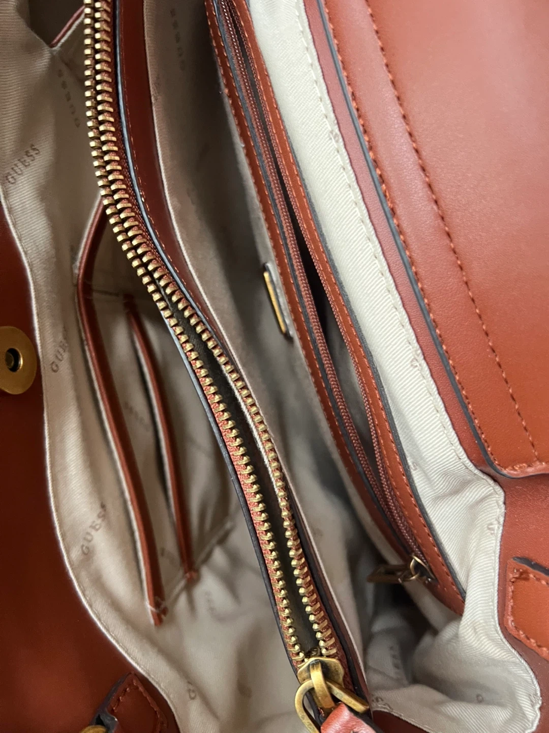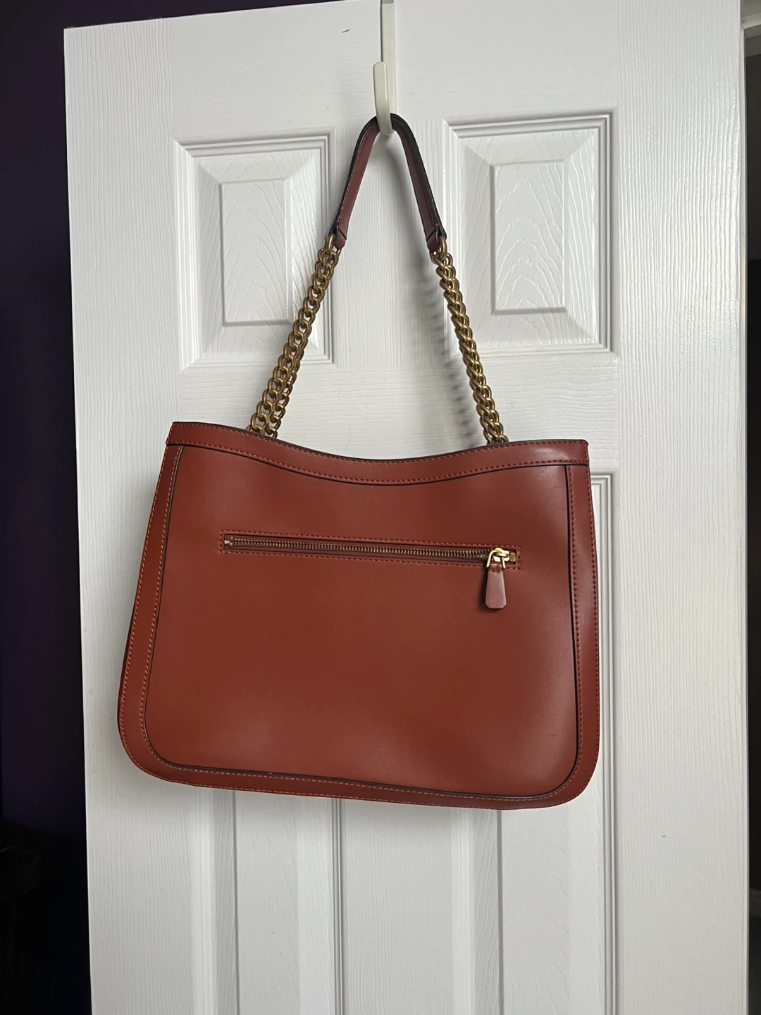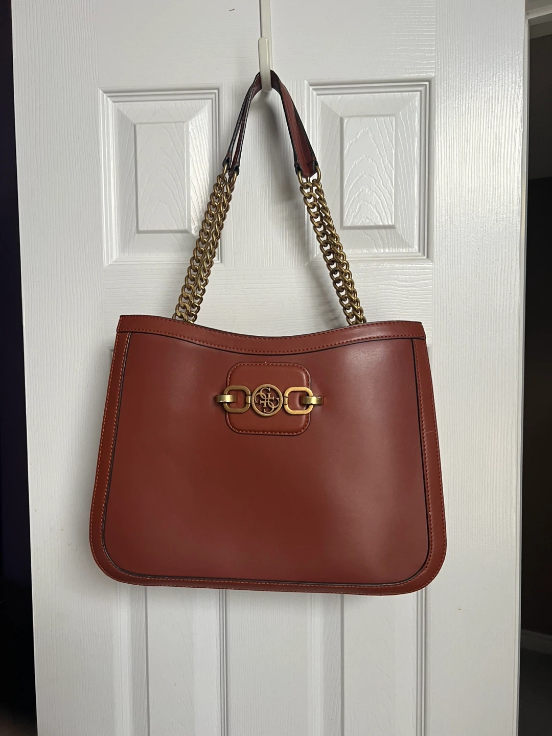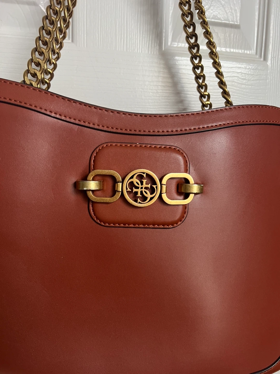 A stylish Guess tote bag in a lovely brown colour! It features gold chain detailing on the straps and a spacious interior with multiple compartments for all your essentials.