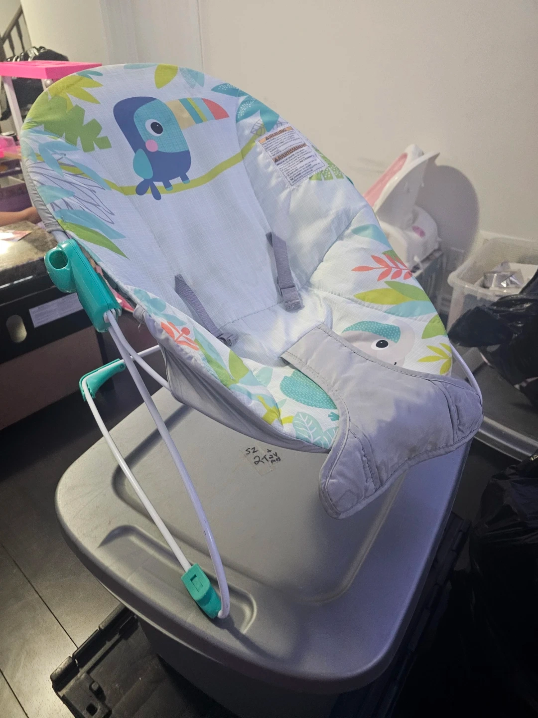 Selling a Bright Starts baby bouncer. It's in great condition and ready for a new little one! The bouncer features a cute sloth design on the seat and a colourful toucan pattern on the canopy. Perfect for keeping your baby entertained and comfortable.