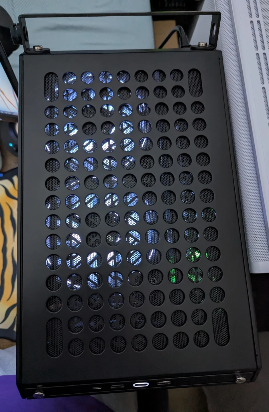 Rear USB-C works but front doesn't since the motherboard doesn't have a header for it. There is an adapter that you can get to run it off the motherboard USB 2.0 or 3.0 ports.