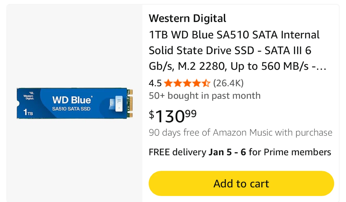1 / 21 / 2Buy & SellNew WD Blue SA510 1TB SATA SSDNew WD Blue SA510 1TB SATA SSD$200Selling a brand new, never opened WD Blue SA510 1TBConditionNewBrandWDWHERE TO MEETCheck LocationView MapSELLERLataMilliken1089 reviews0 chats·2 favorites·53 viewsSEND CHAT TO SELLERHi Lata! I’m interested in your listing.Hi Lata! I’m interested in your listing.Get the Karrot app to chatSign In to chat