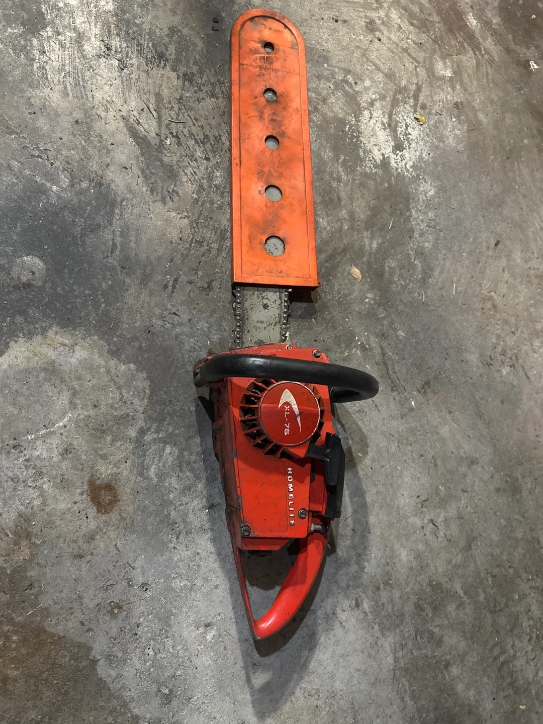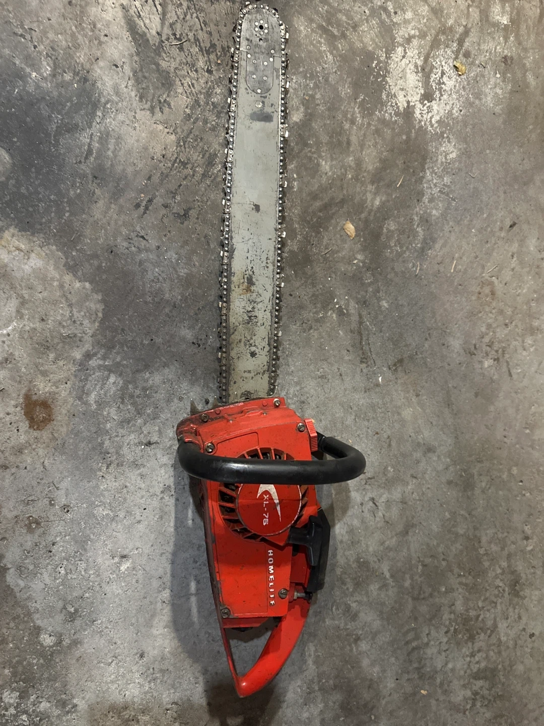 Selling a Homelite XL-76 chainsaw. It shows signs of use but is still functional. Please review the photos to assess the condition.
