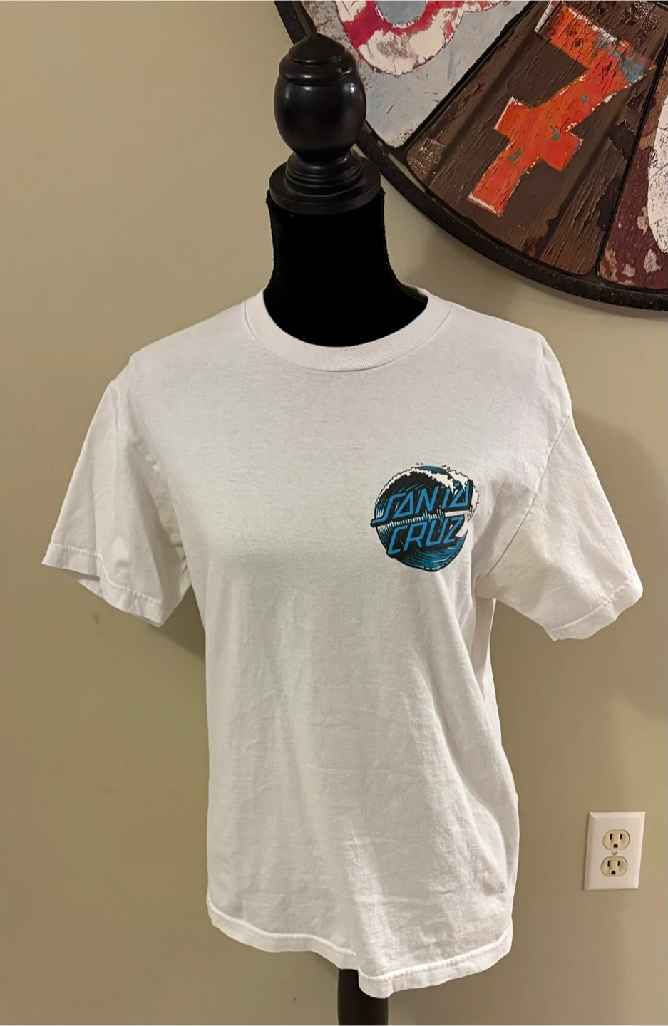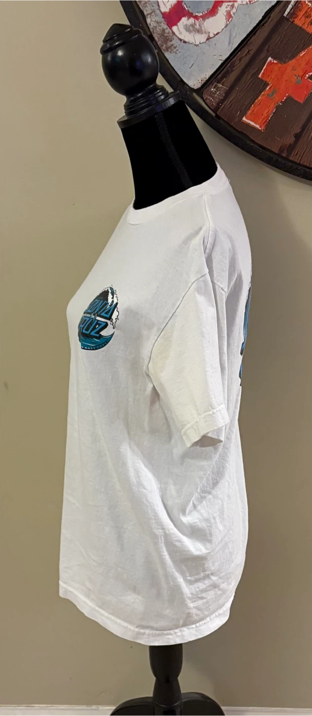 Selling a white Santa Cruz t-shirt! It's in great condition and features the classic Santa Cruz logo on the front and a larger design on the back. Perfect for any fan of the brand! Fits like a ladies S 😊