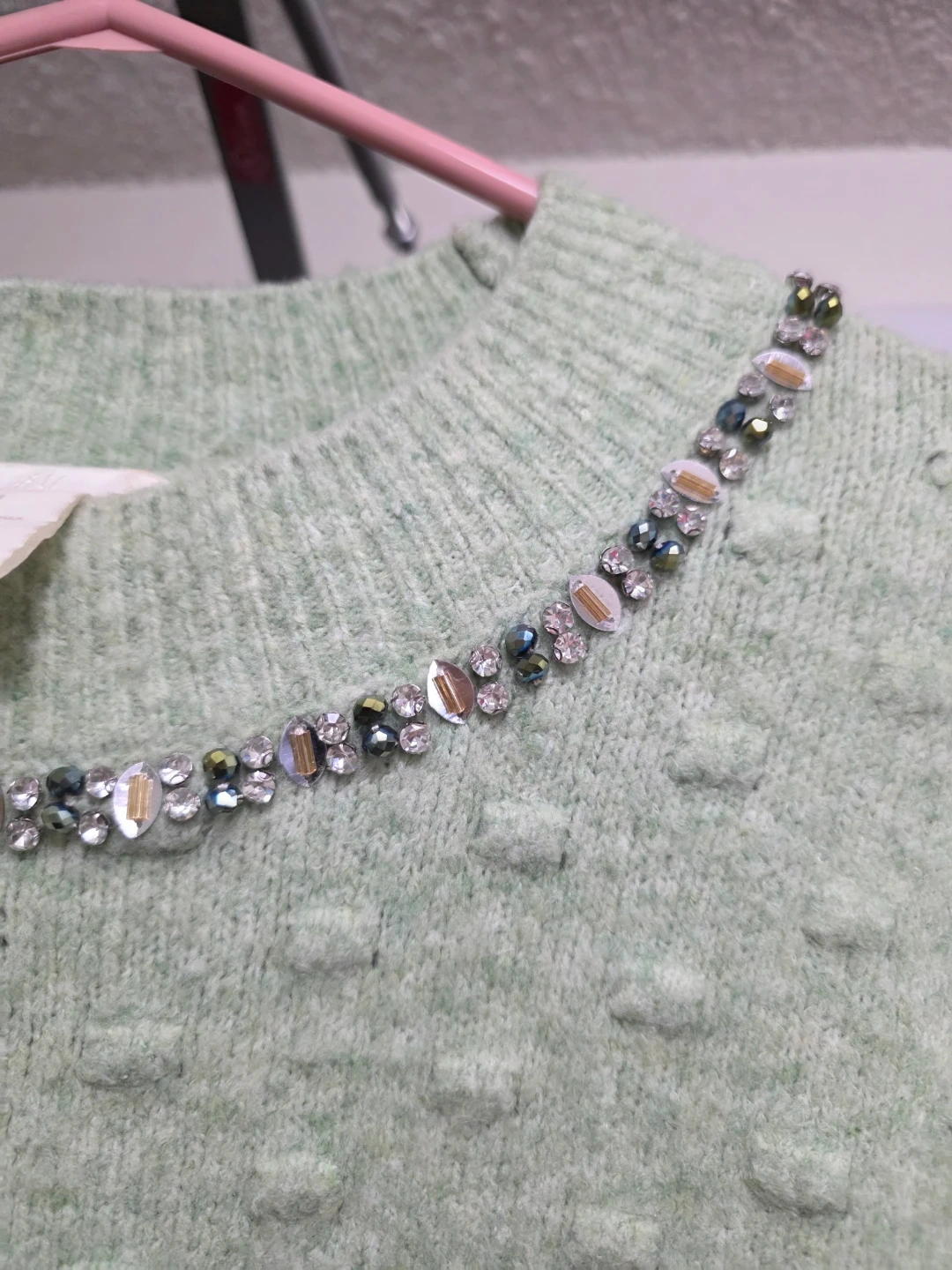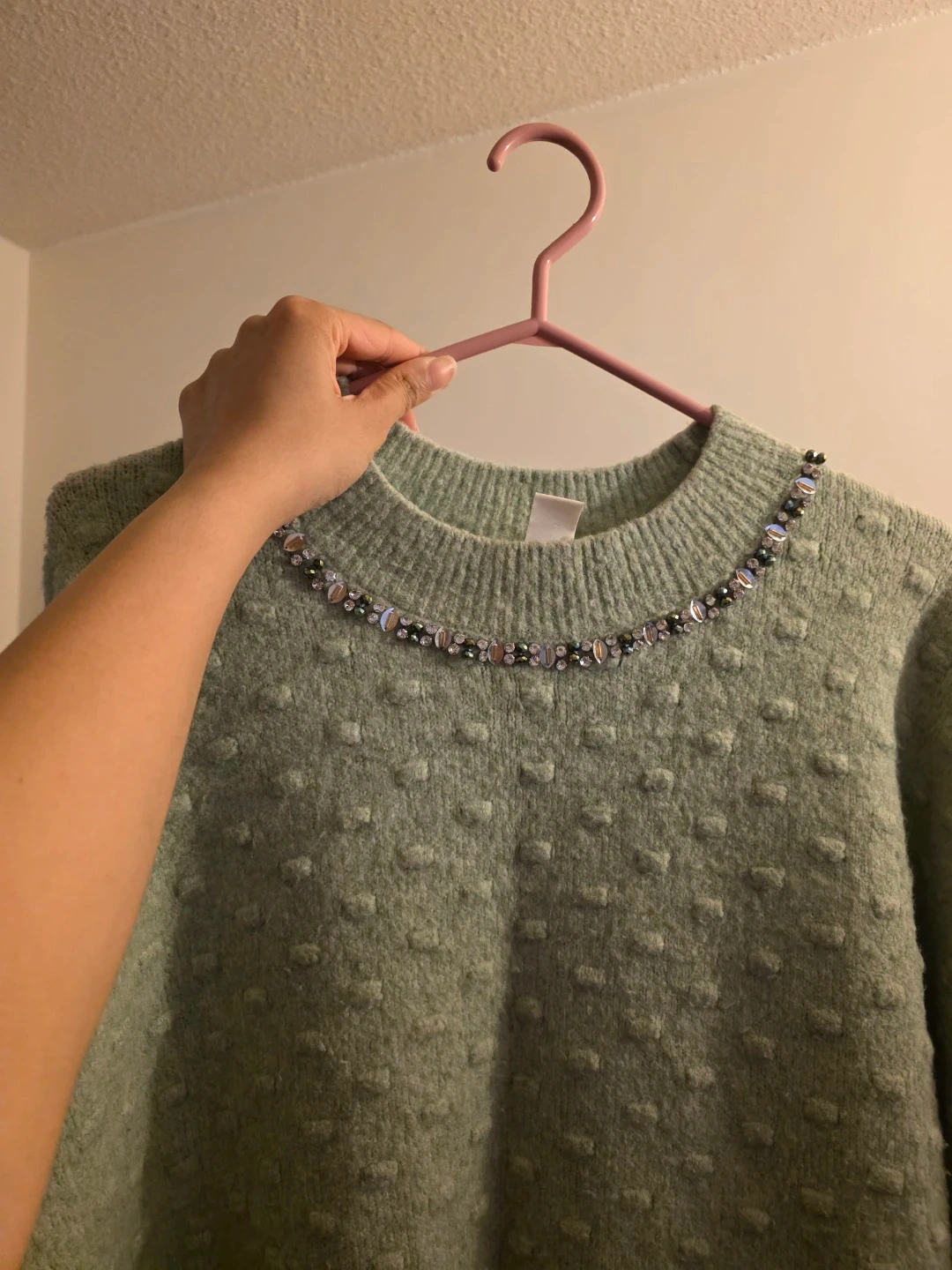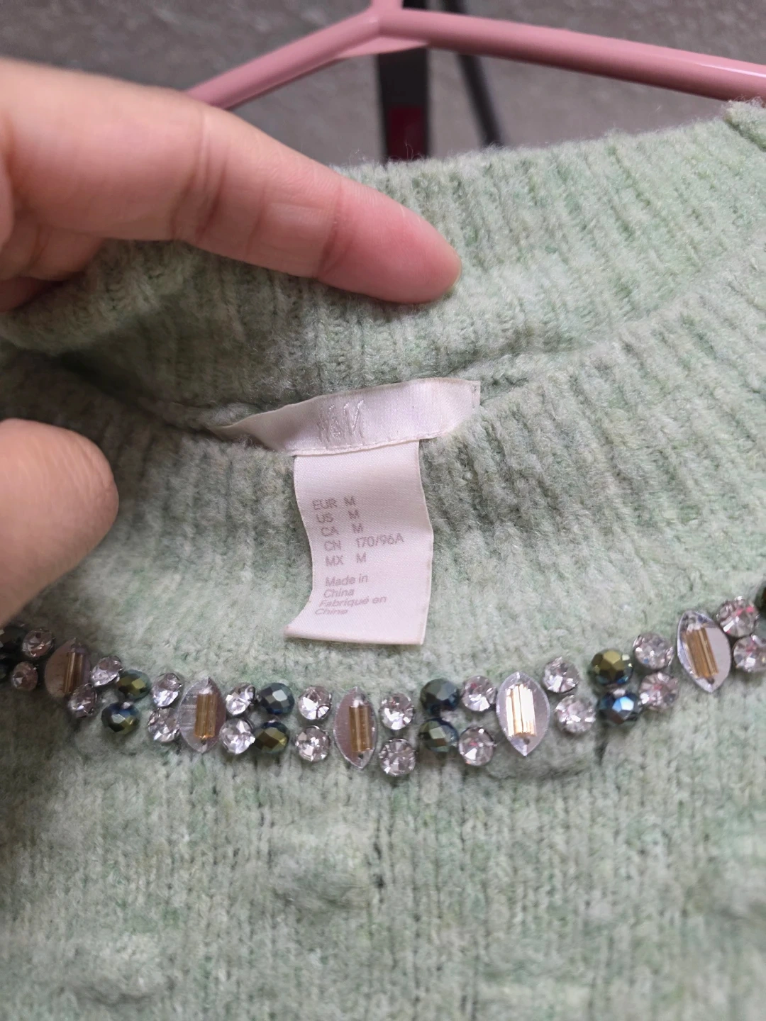 Selling a cute H&M sweater in a lovely light green colour! It's a size medium and features delicate embellishments around the neckline. Perfect for adding a touch of sparkle to your wardrobe!
