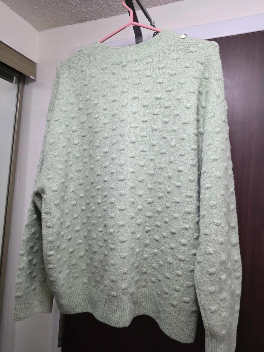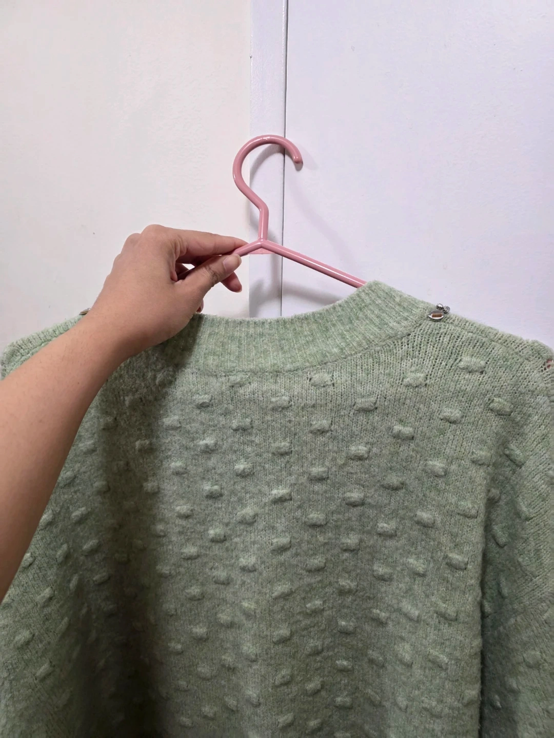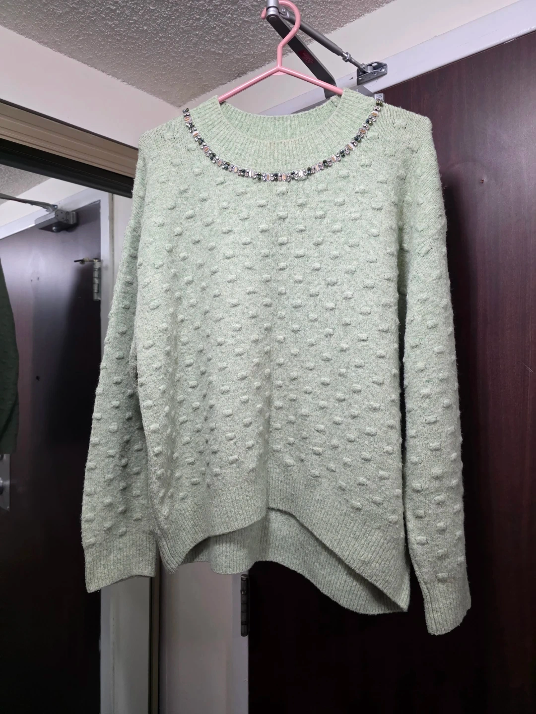 Selling a cute H&M sweater in a lovely light green colour! It's a size medium and features delicate embellishments around the neckline. Perfect for adding a touch of sparkle to your wardrobe!