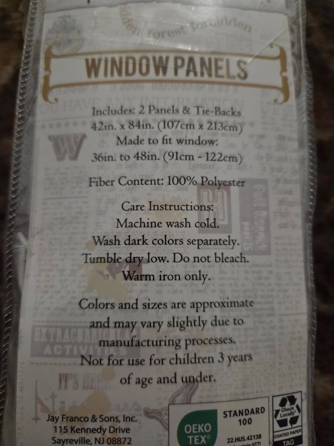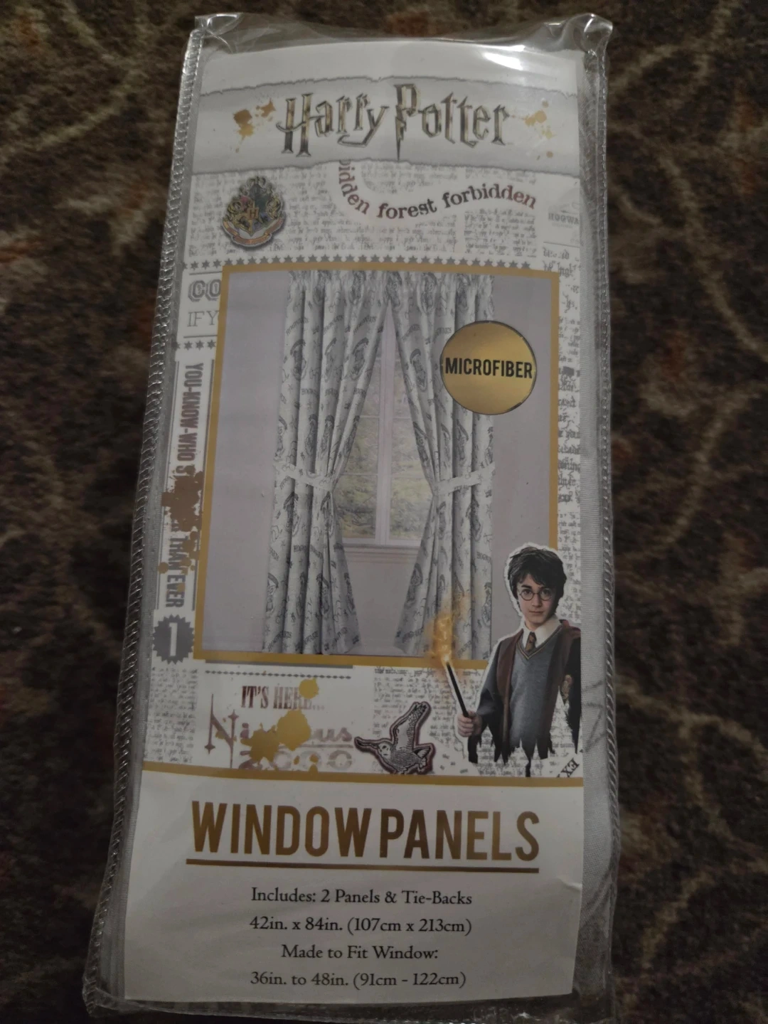 New Harry Potter window panels in original packaging! Includes two panels and tie-backs. Each panel is 42 inches x 84 inches (107 cm x 213 cm). Made to fit windows 36 inches to 48 inches (91 cm - 122 cm). The fiber content is 100% polyester. Machine wash cold, wash dark colours separately, tumble dry low, and warm iron only