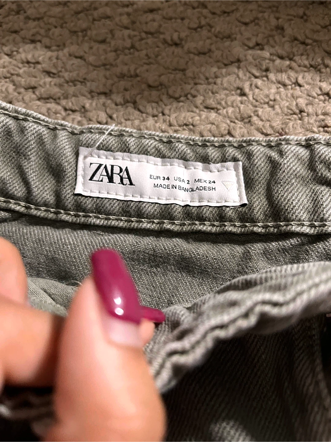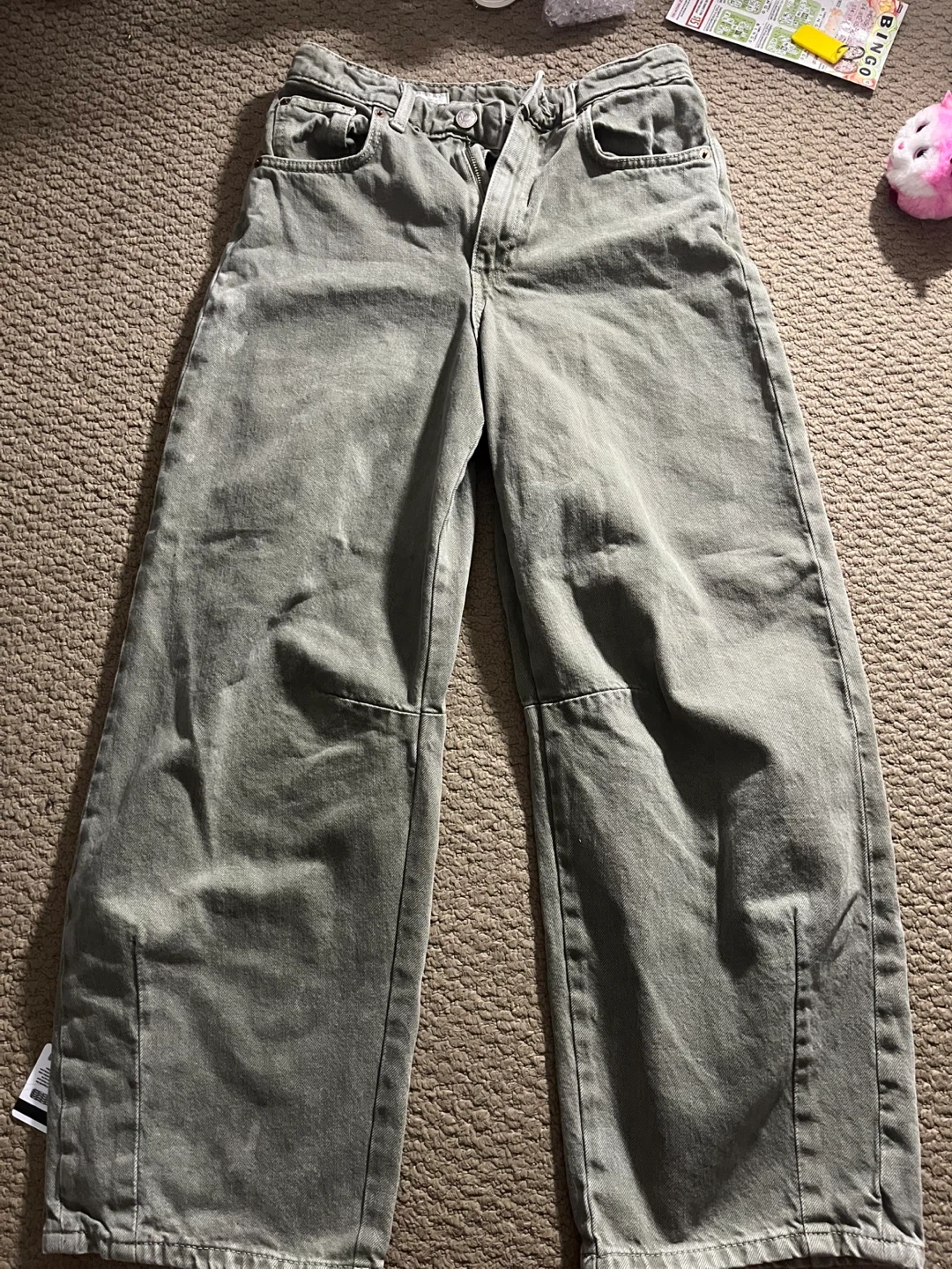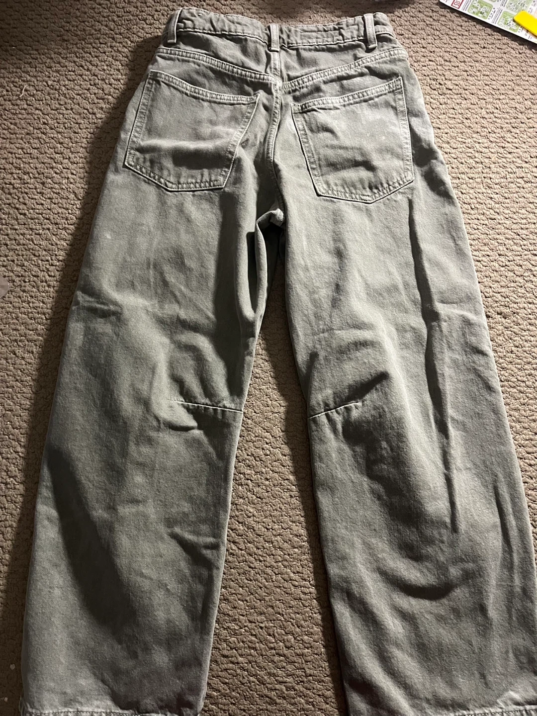 Selling a pair of Zara wide leg jeans in a lovely muted green colour. They're a size 2 (USA) / 34 (EUR). They're in great condition and ready for a new owner. There is some discolouration in areas as shown in the description photos, but are undamaged otherwise. Comes from a smoke free and pet free home