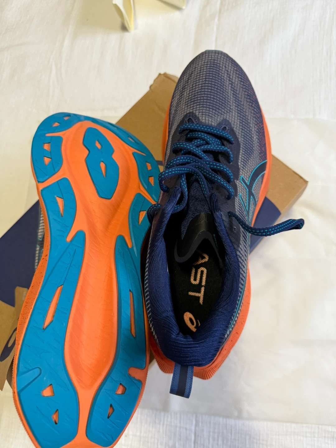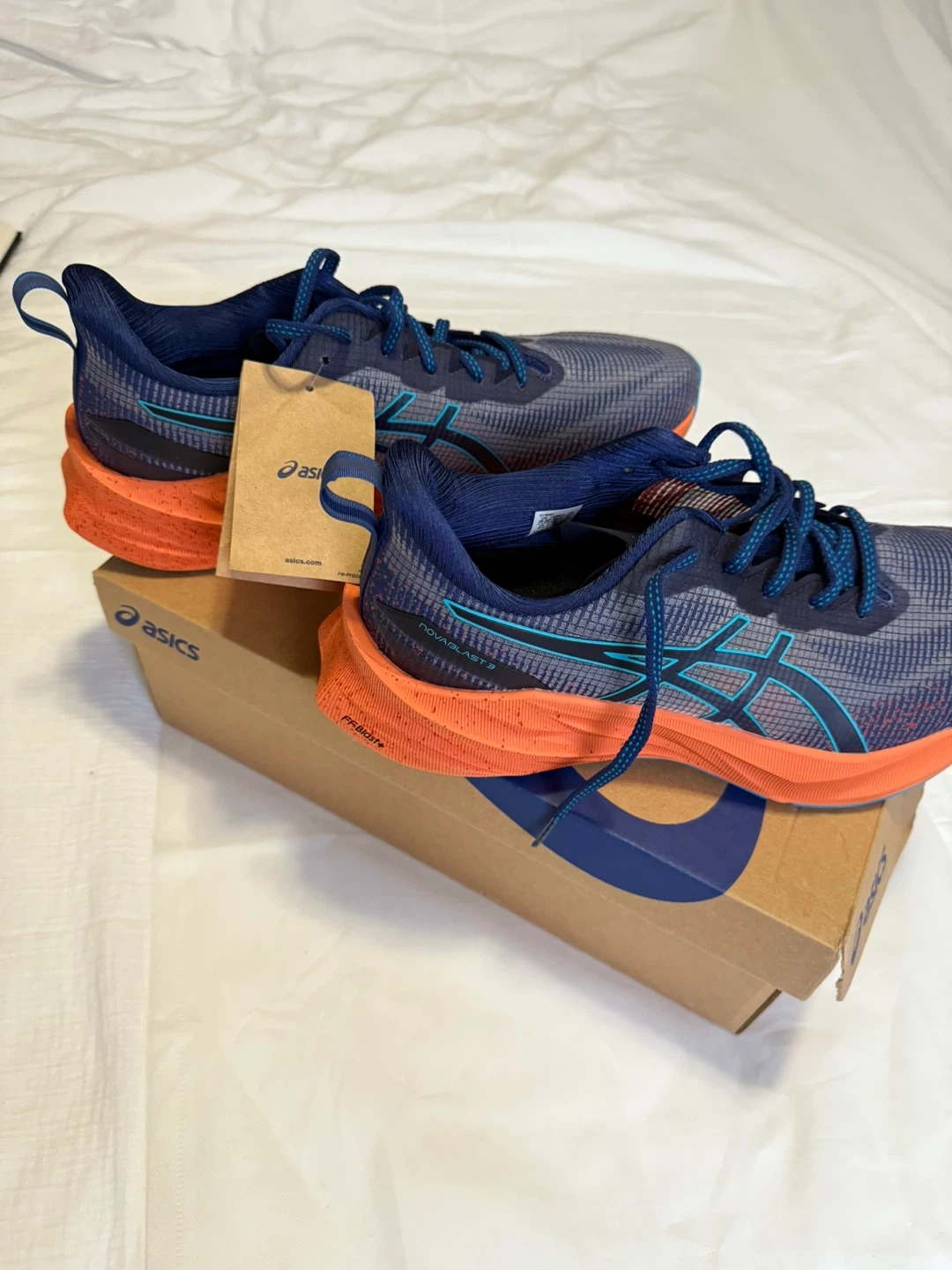 Selling a pair of Asics Novablast 4 running shoes in US size 10.5 They're brand new and come with the original box! The colour is a nice mix of blue and orange. Perfect for running or just everyday wear!