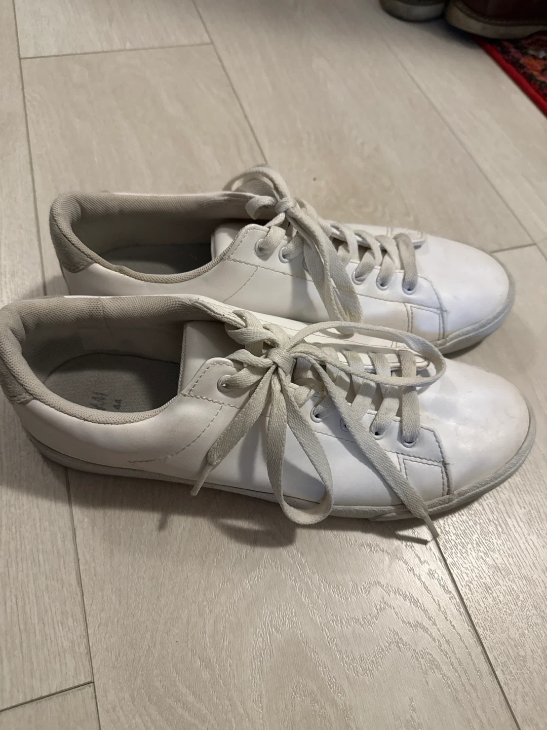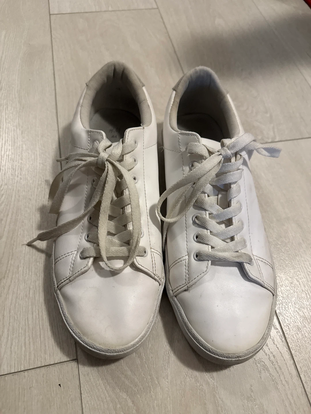 Selling a pair of white sneakers, perfect for everyday wear! They show some signs of use, but still have plenty of life left in them. A great addition to your footwear collection!