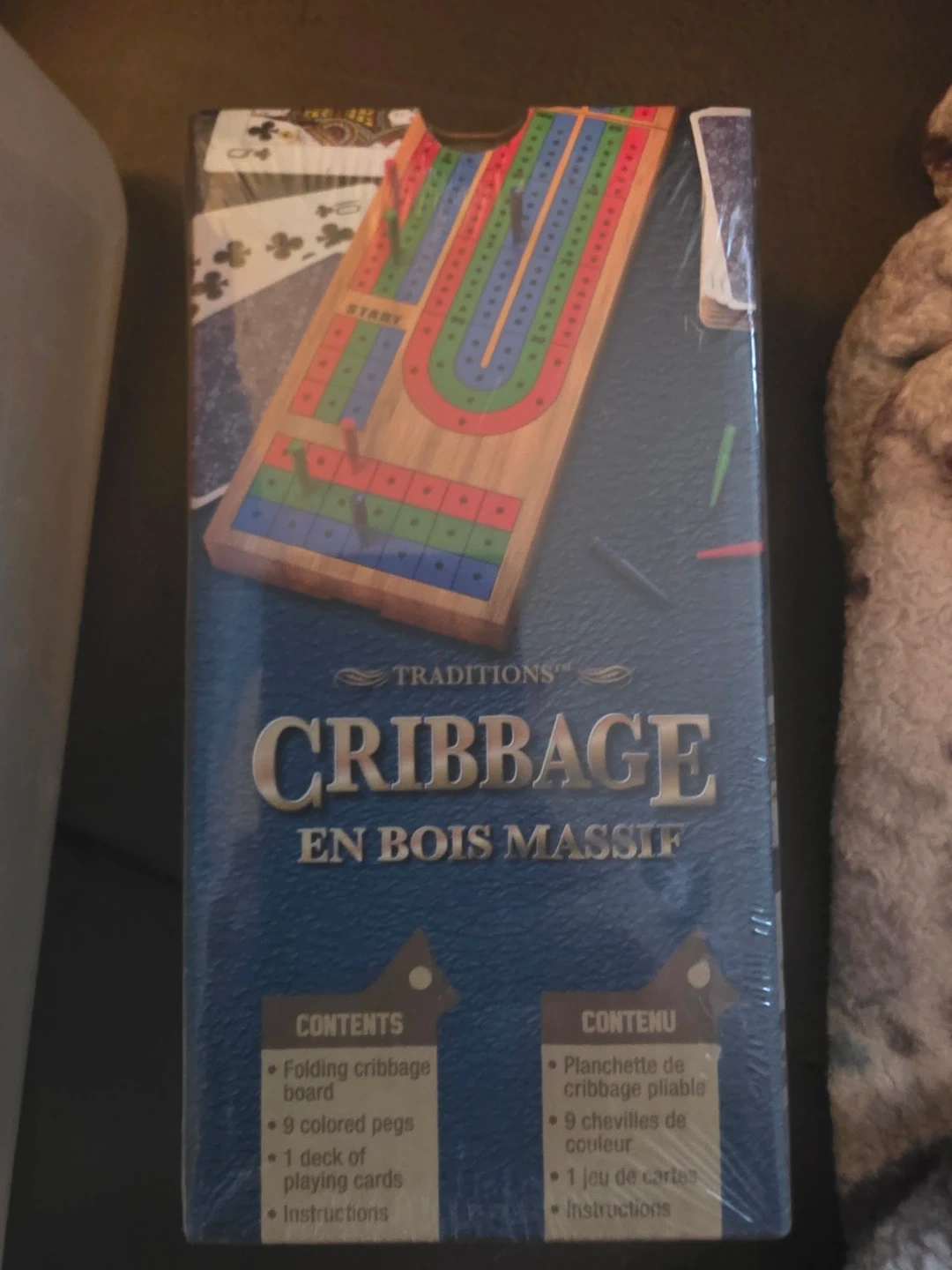 Selling a brand new Traditions Cribbage en Bois Massif game! It includes a folding cribbage board, 9 coloured pegs, a deck of playing cards, and instructions. The box is still sealed, so everything is in perfect condition
