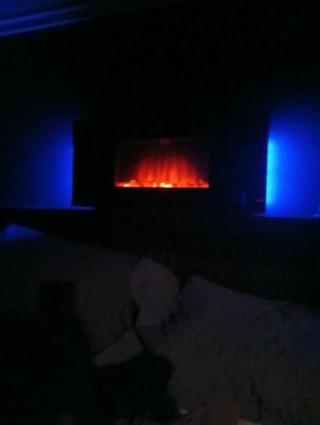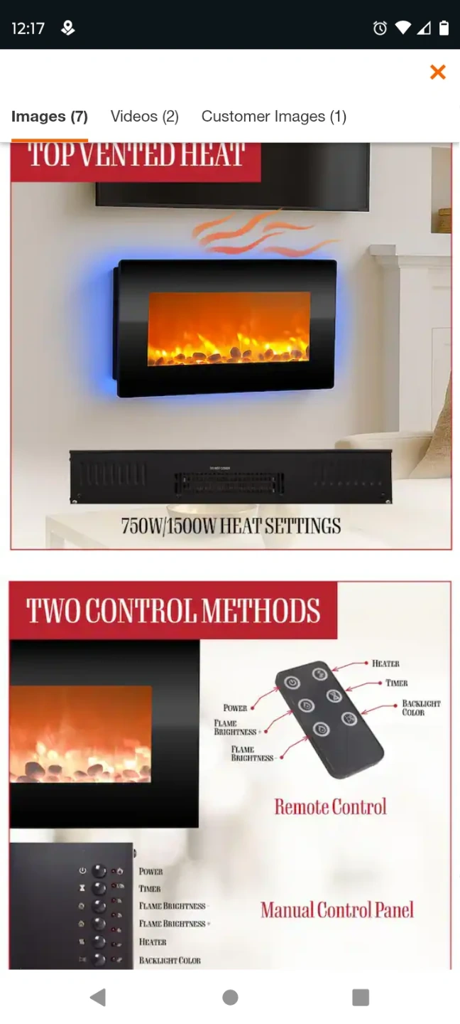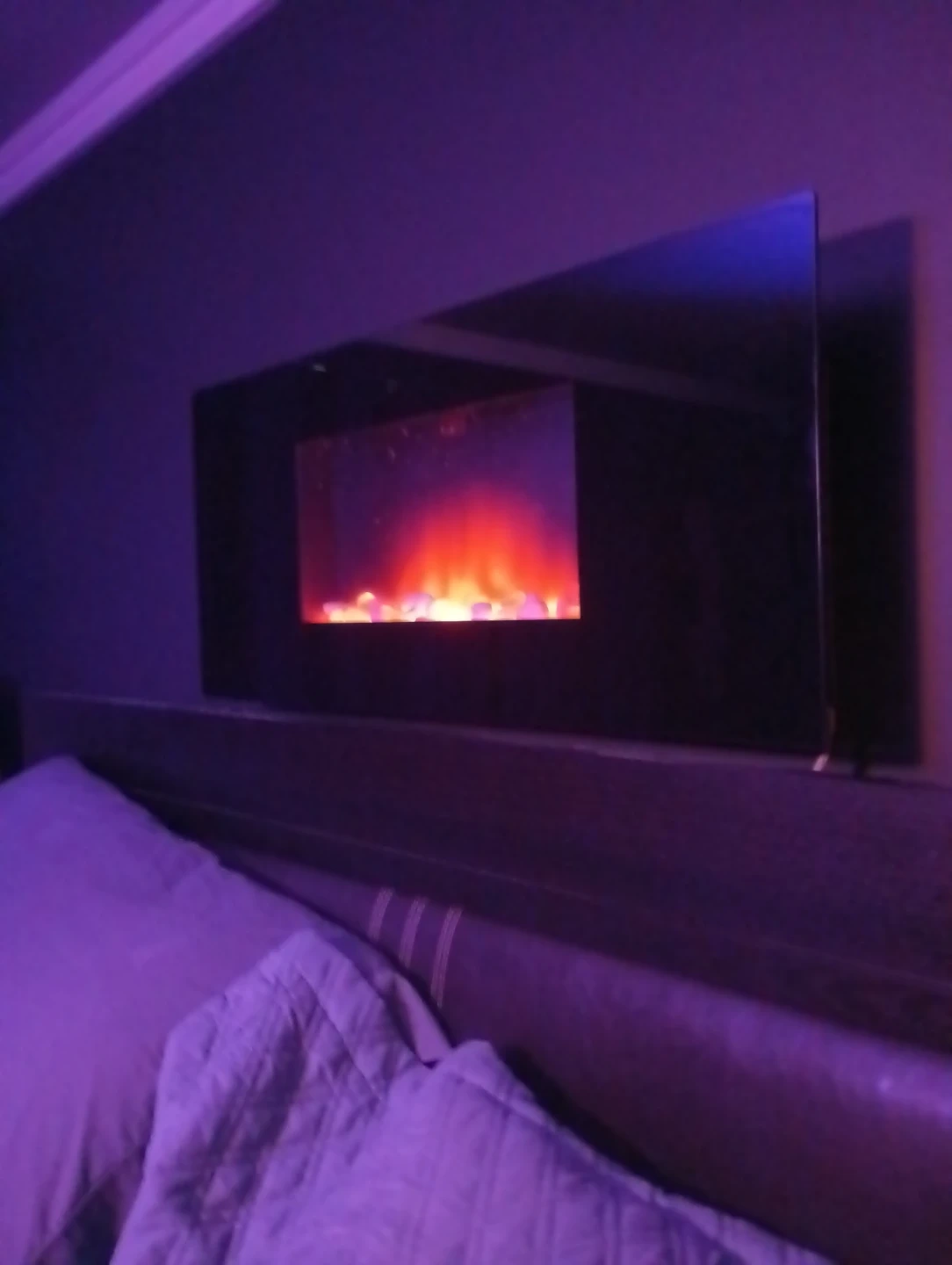 38" with heater or without three flame and heater intensities. can also just use for flame visuals and color. It has built in LED strips that can light up the back wall. Renovating and need off the wall