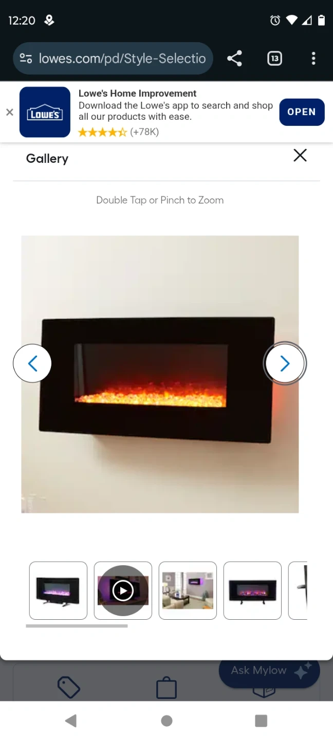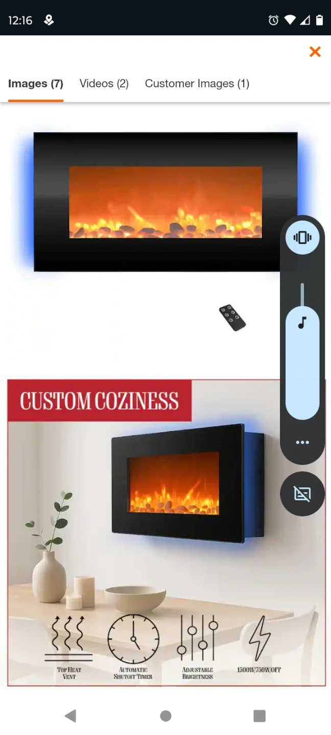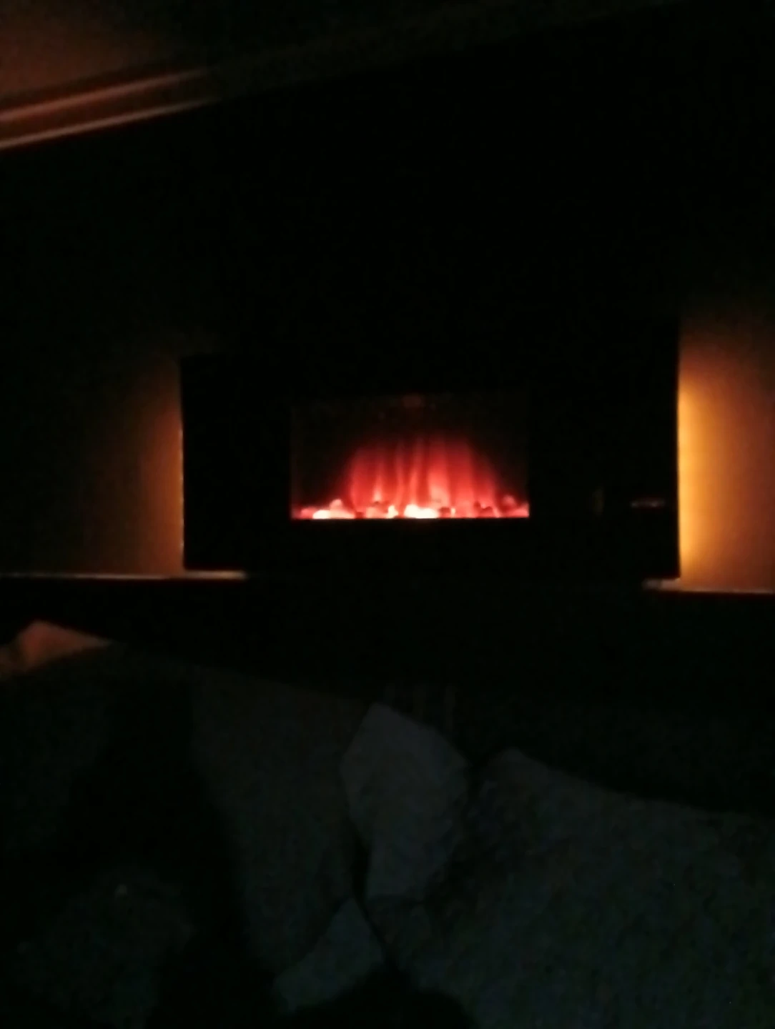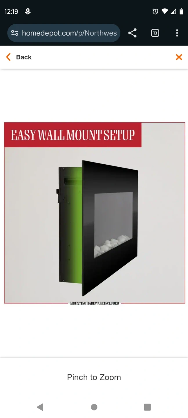 38" with heater or without three flame and heater intensities. can also just use for flame visuals and color. It has built in LED strips that can light up the back wall. Renovating and need off the wall