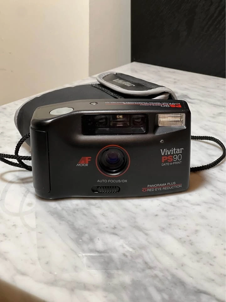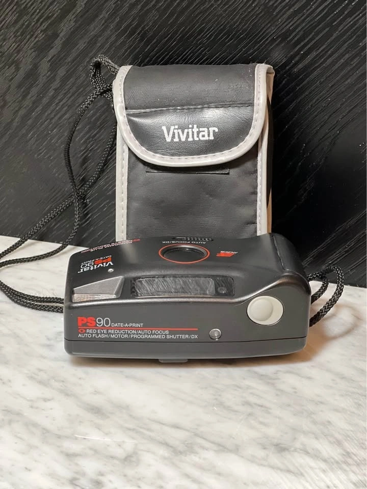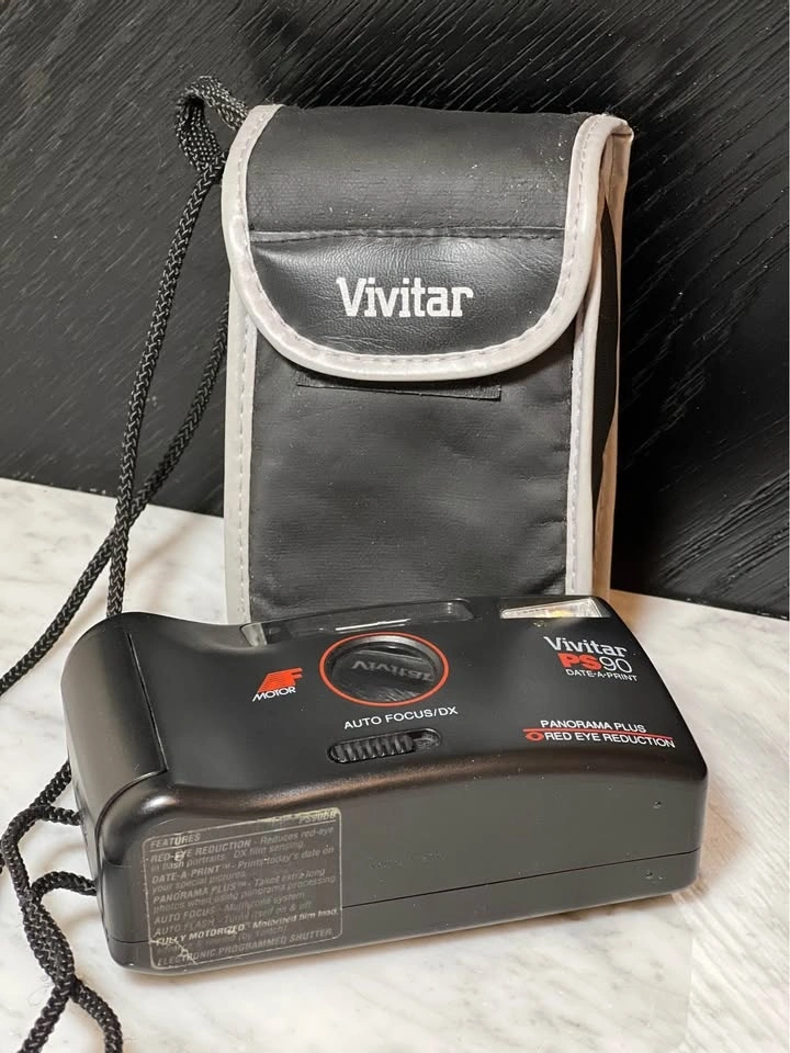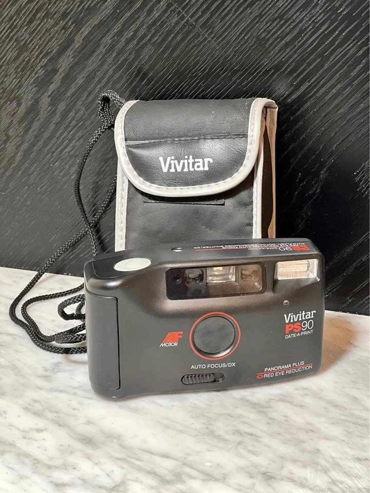 This camera is a Vivitar PS90 Date-A-Print 35mm point-and-shoot film camera, which was first released in 1992. It is known for being a beginner-friendly, fully automatic camera with a few useful features.