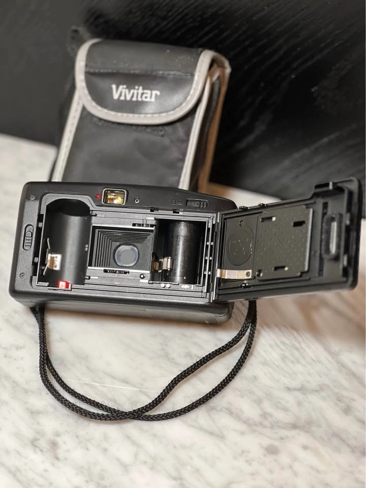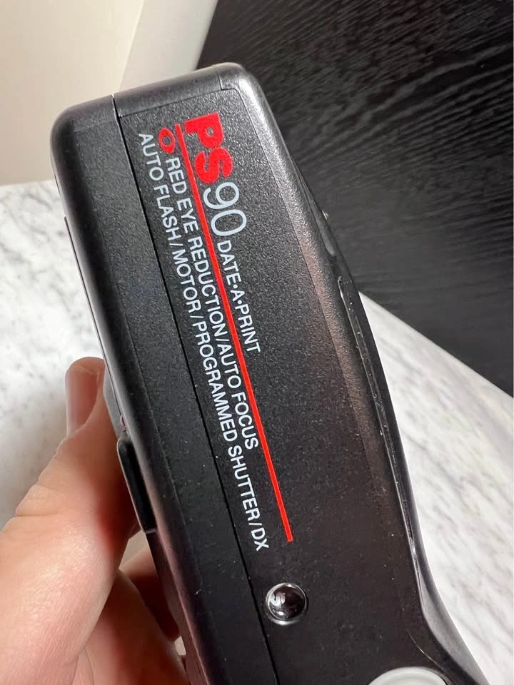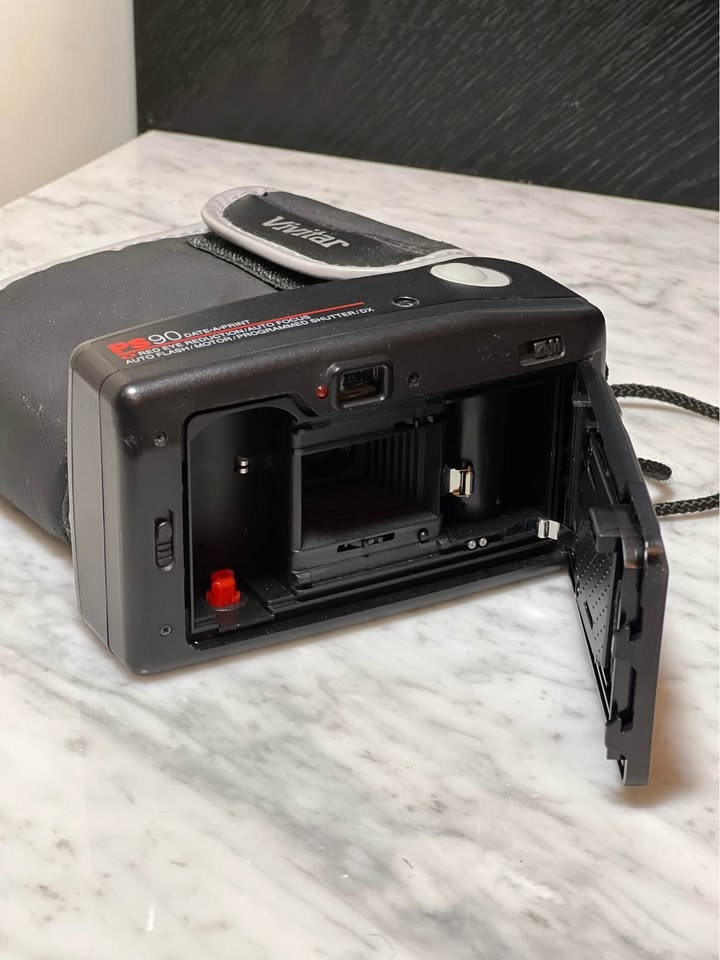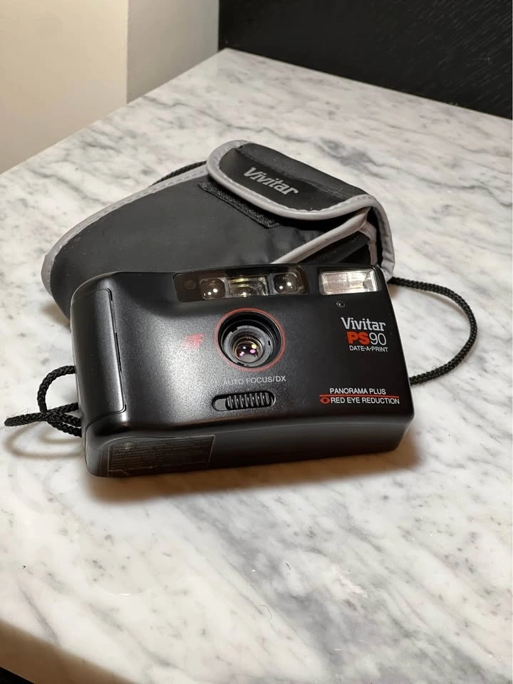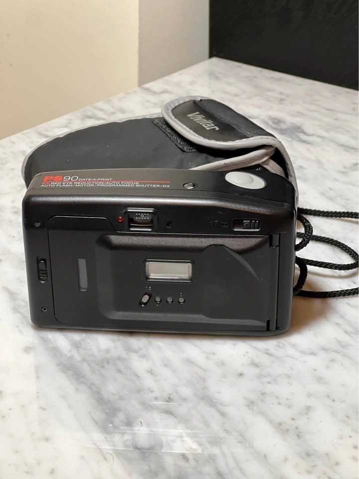 This camera is a Vivitar PS90 Date-A-Print 35mm point-and-shoot film camera, which was first released in 1992. It is known for being a beginner-friendly, fully automatic camera with a few useful features.