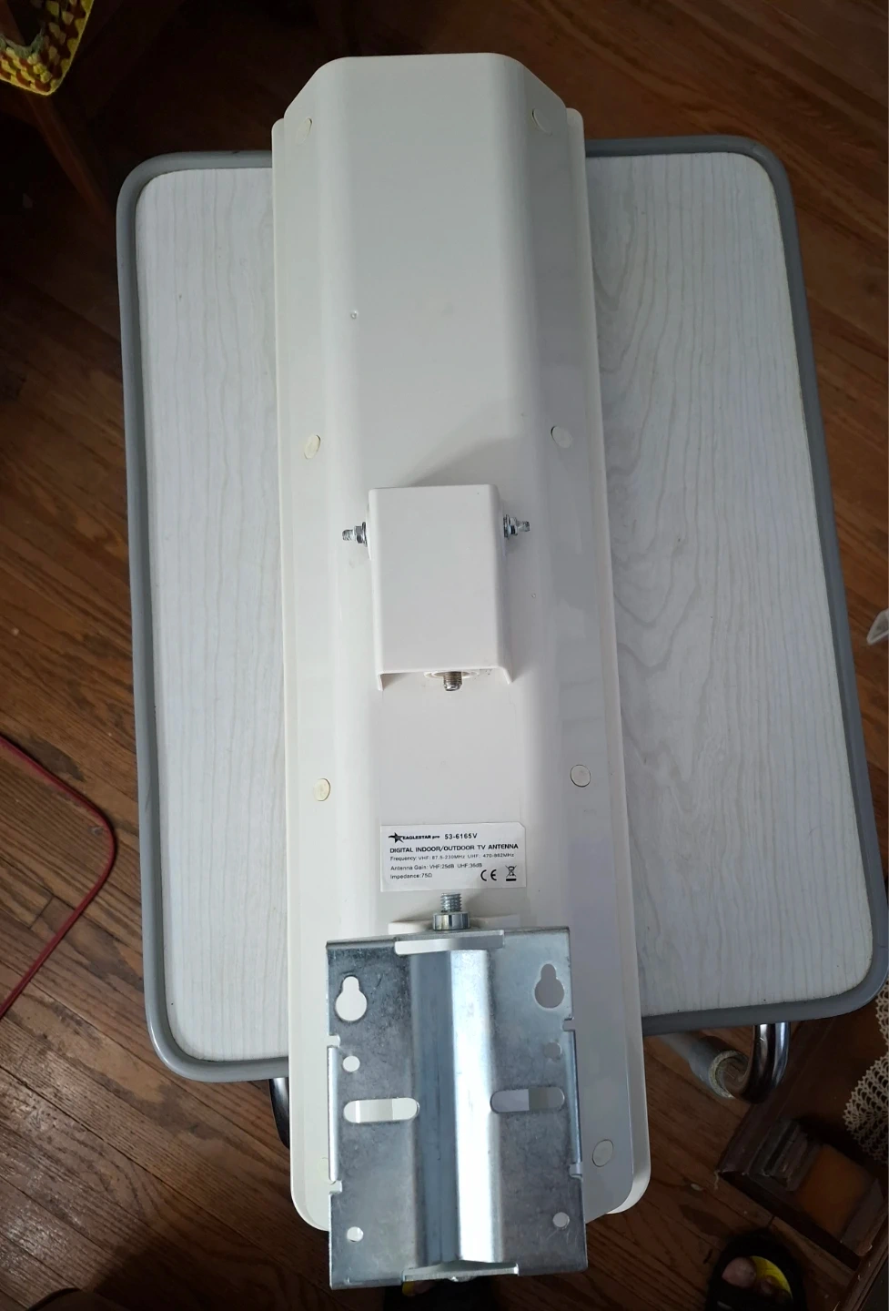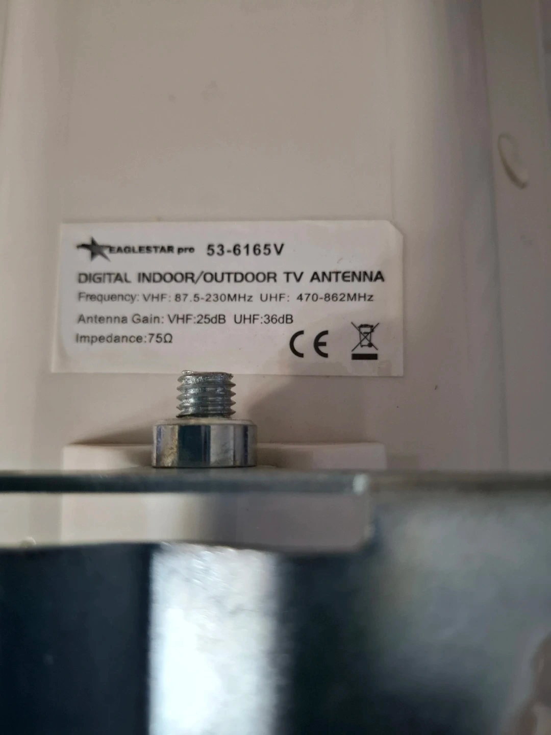 Selling an EAGLESTAR pro 53-6165V Digital Indoor/Outdoor TV Antenna. It has a frequency of VHF: 87.5-230MHz and UHF: 470-862MHz. Also, the antenna gain is VHF: 25dB and UHF: 36dB. It has an impedance of 75Ω