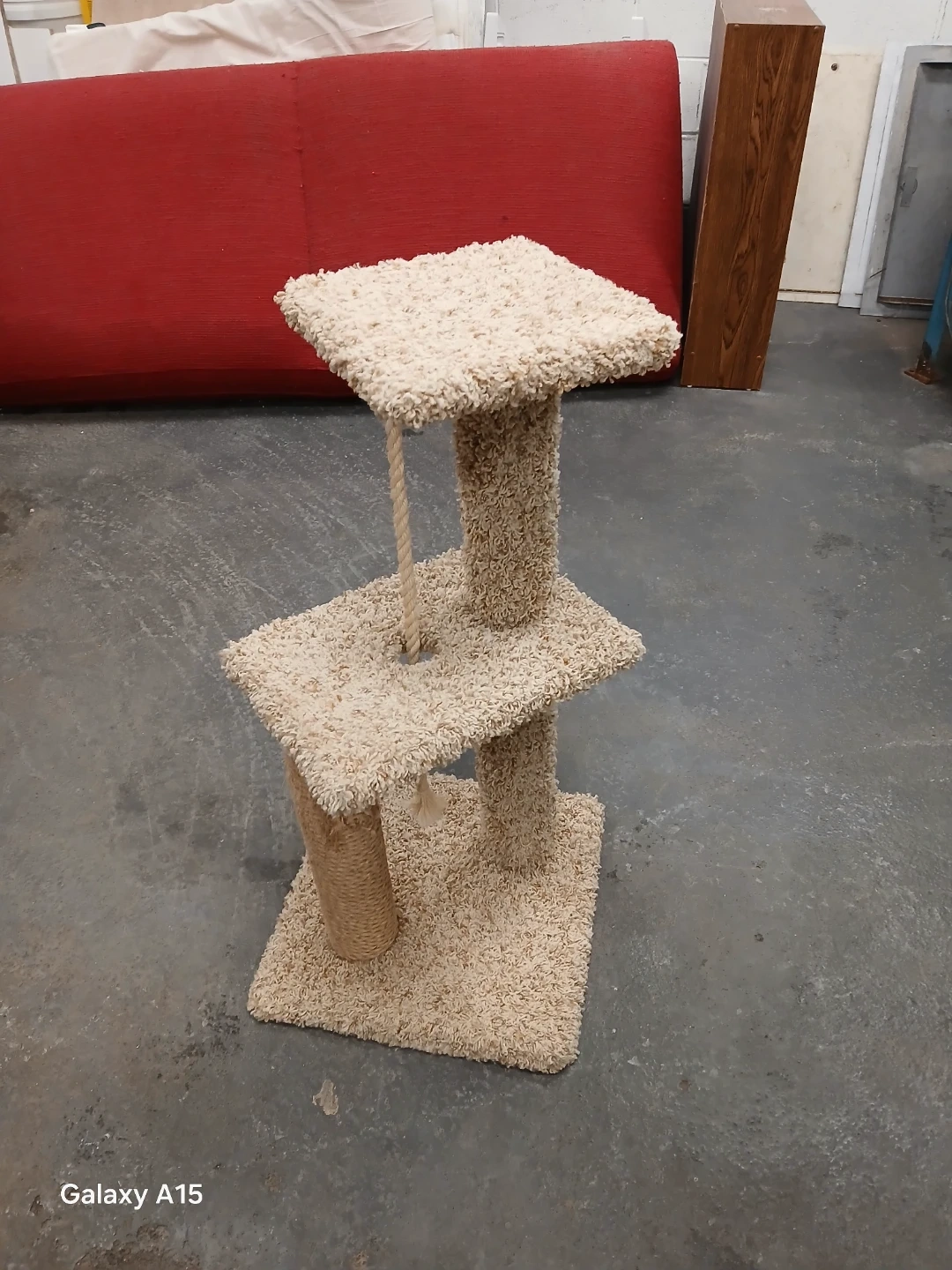 Selling a cat tree with a scratching post! It's in good condition and ready for a new feline friend. The tree has multiple levels for your cat to explore and relax on, and the scratching post will help keep their claws healthy and your furniture safe