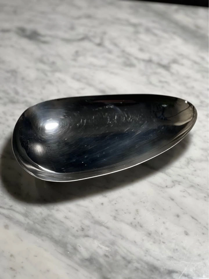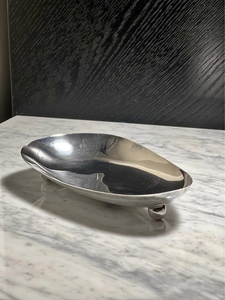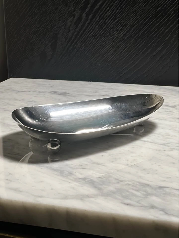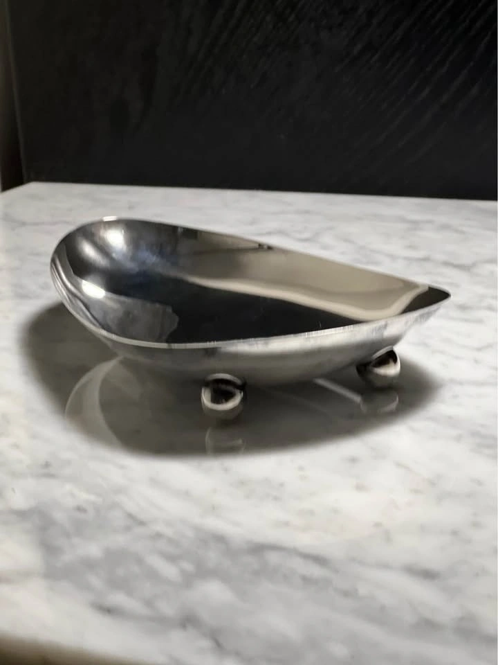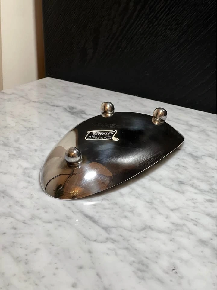 This is a mid-century modern W.&S. Blackinton silver plate dish with three ball feet.