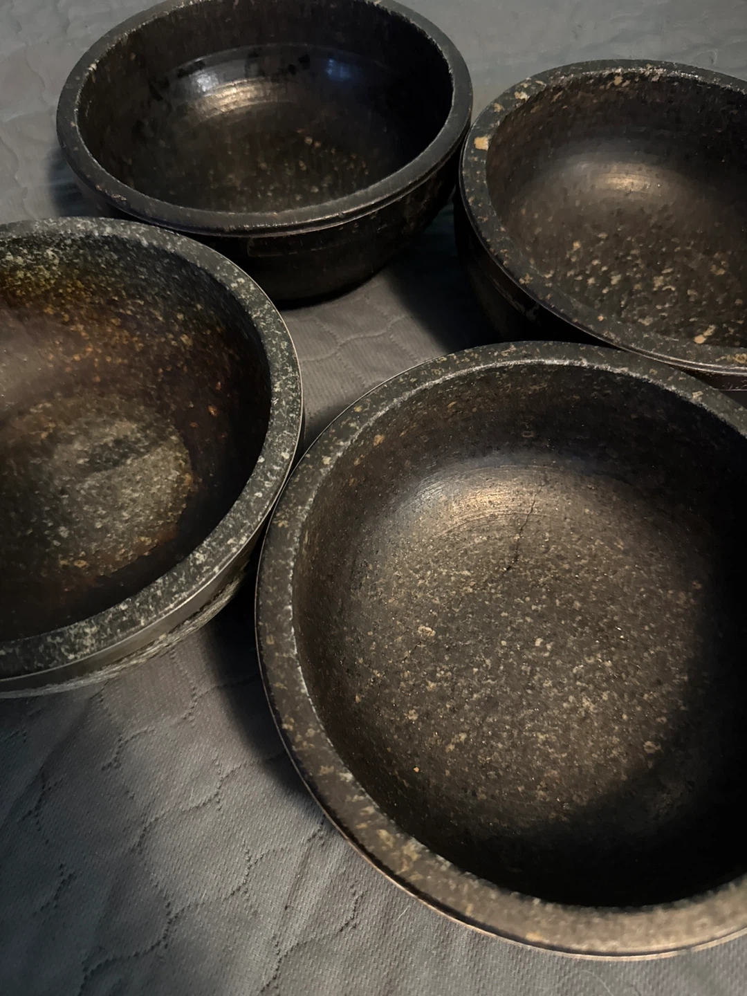 Selling a set of four dark stone bowls. They have a nice, rustic look and are perfect for serving or decoration. They show some signs of use but are still in good condition!