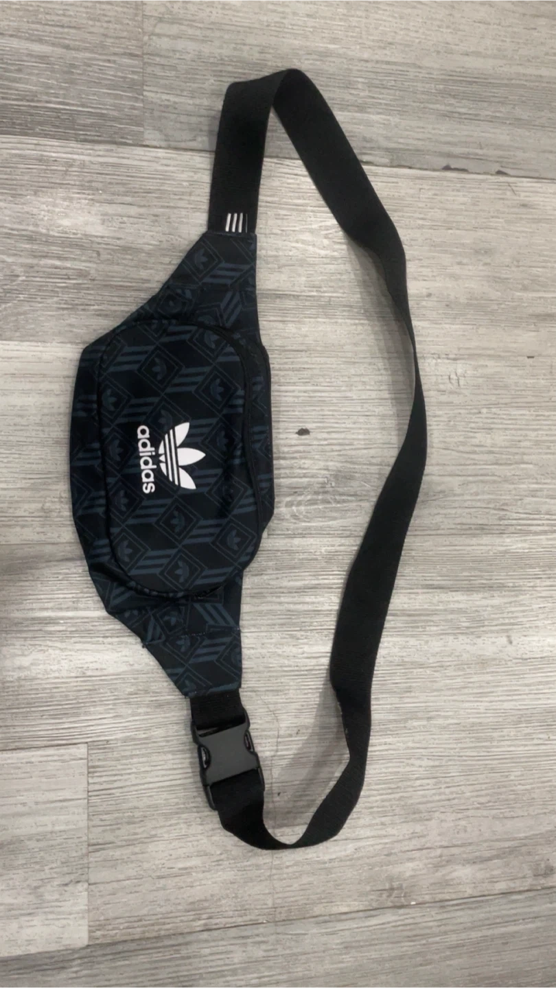 Here's an Adidas waist bag in great condition! It features a black and blue patterned design with the Adidas logo on the front. Perfect for carrying your essentials on the go!
