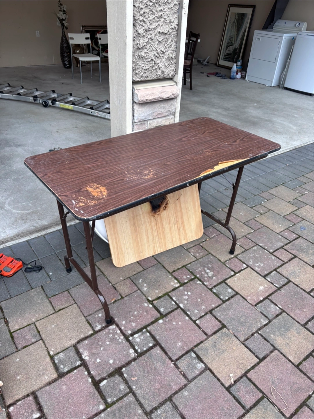 Selling a folding table with a brown top and metal legs. It shows some signs of wear on the surface, as pictured. Perfect for extra space when you need it!