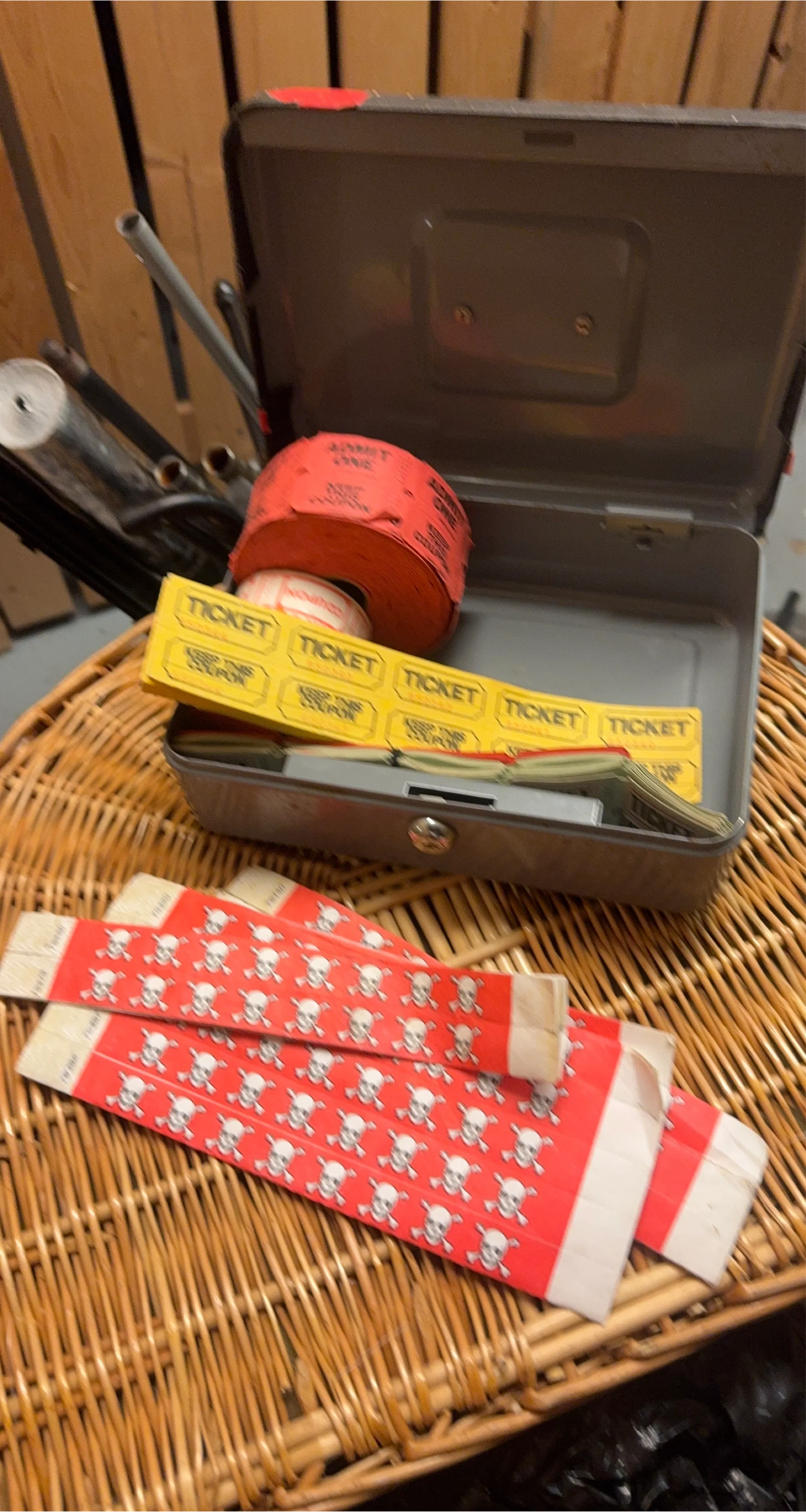 Selling a collection of tickets and coupons, including red skull-patterned wristbands and yellow 'Keep This Coupon' tickets. Perfect for events or collectors! I have the coin tray as well.