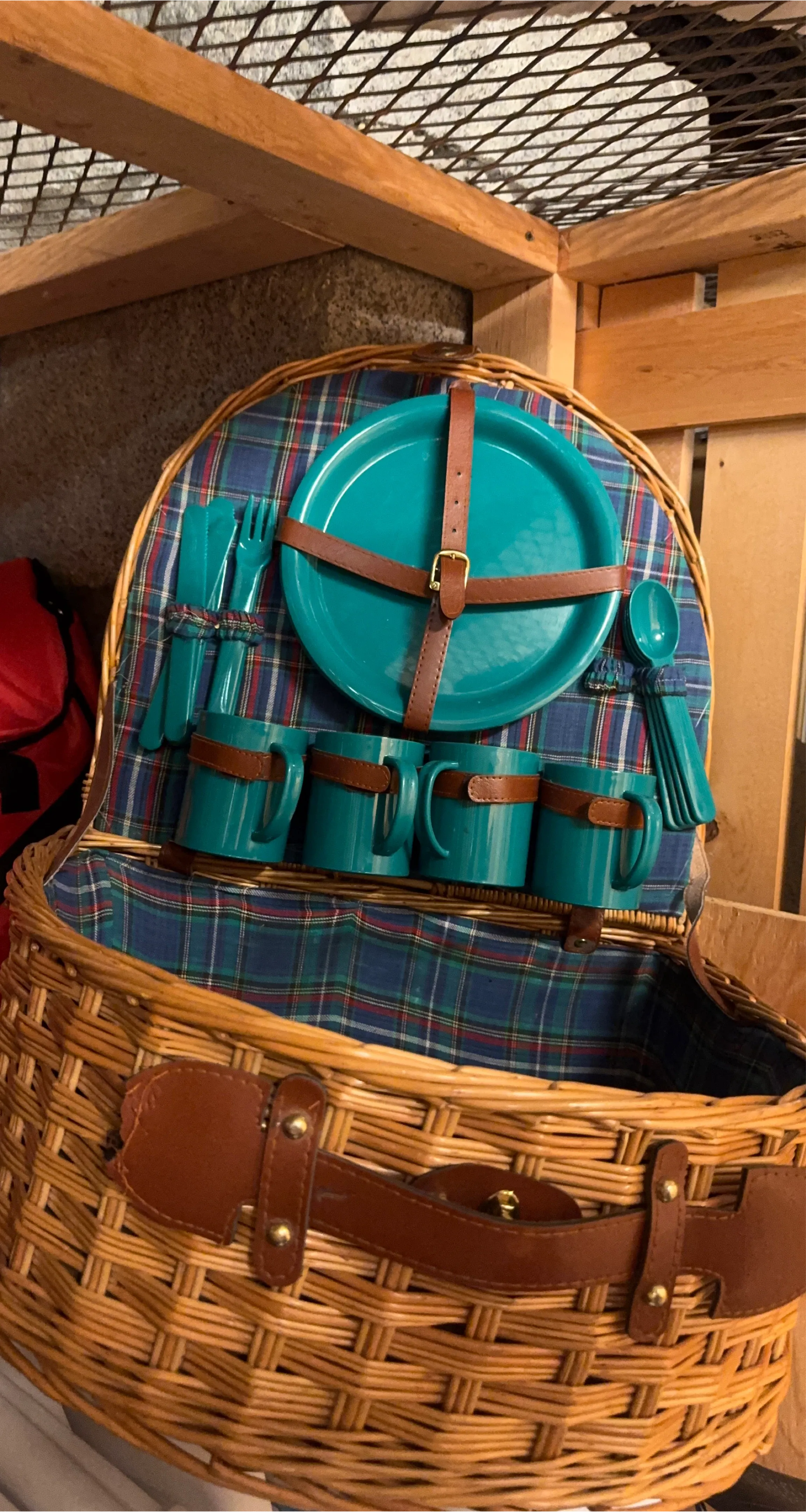 Selling a cute picnic basket! It comes with all the essentials for a lovely outdoor meal. Includes plates, cutlery, and mugs, all in a matching teal colour. The basket itself is made of wicker with a leather handle and closures. Perfect for picnics in the park!