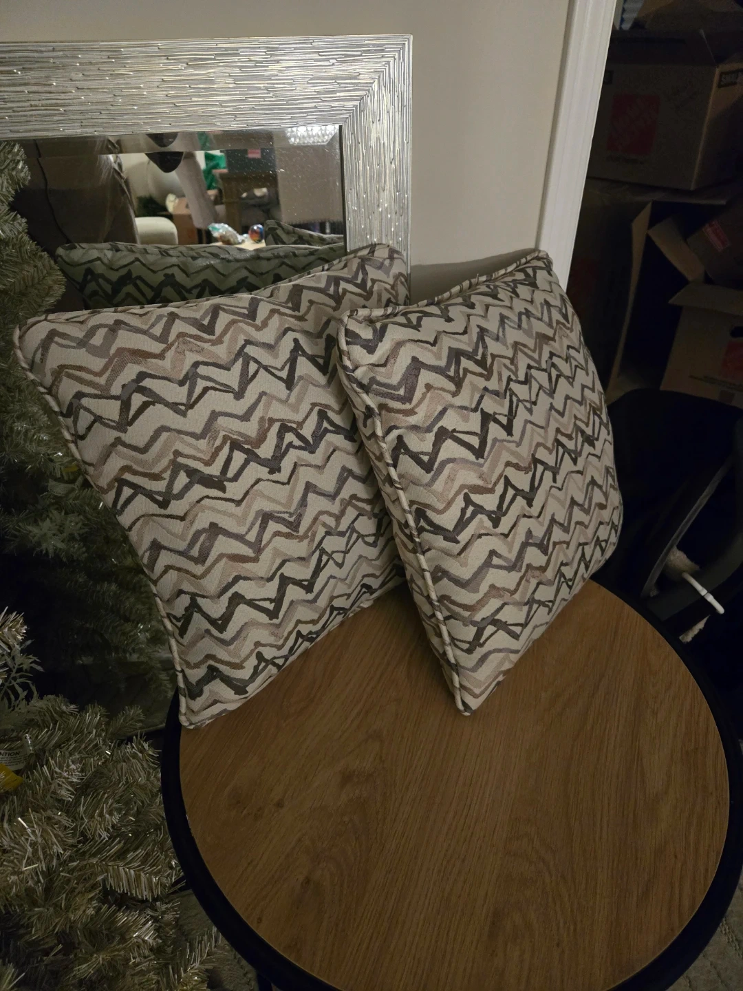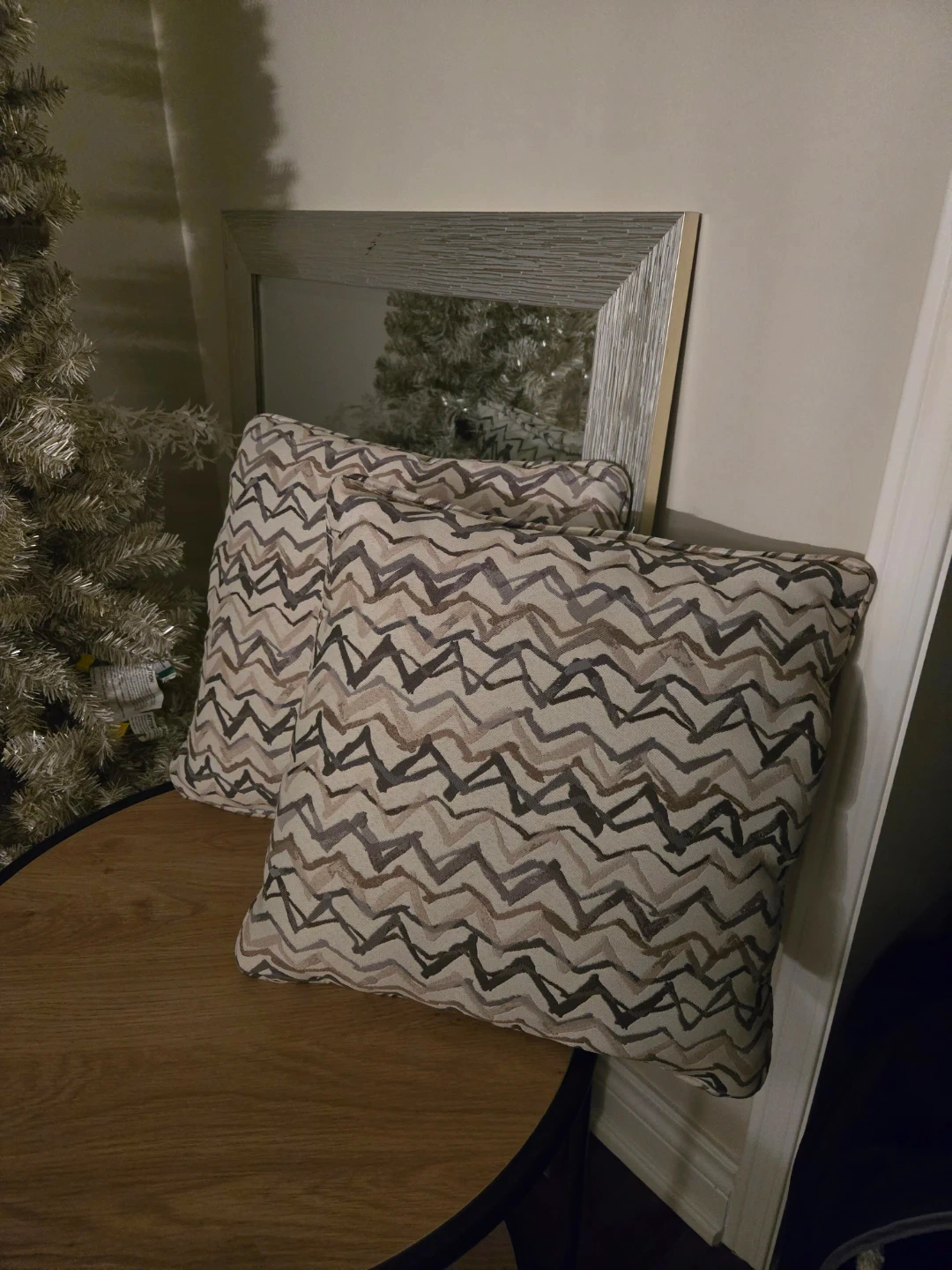 Selling a set of two decorative throw pillows! They have a cool, modern pattern in neutral tones that would look great in any living room or bedroom. They're in good condition and ready to add some style to your space!