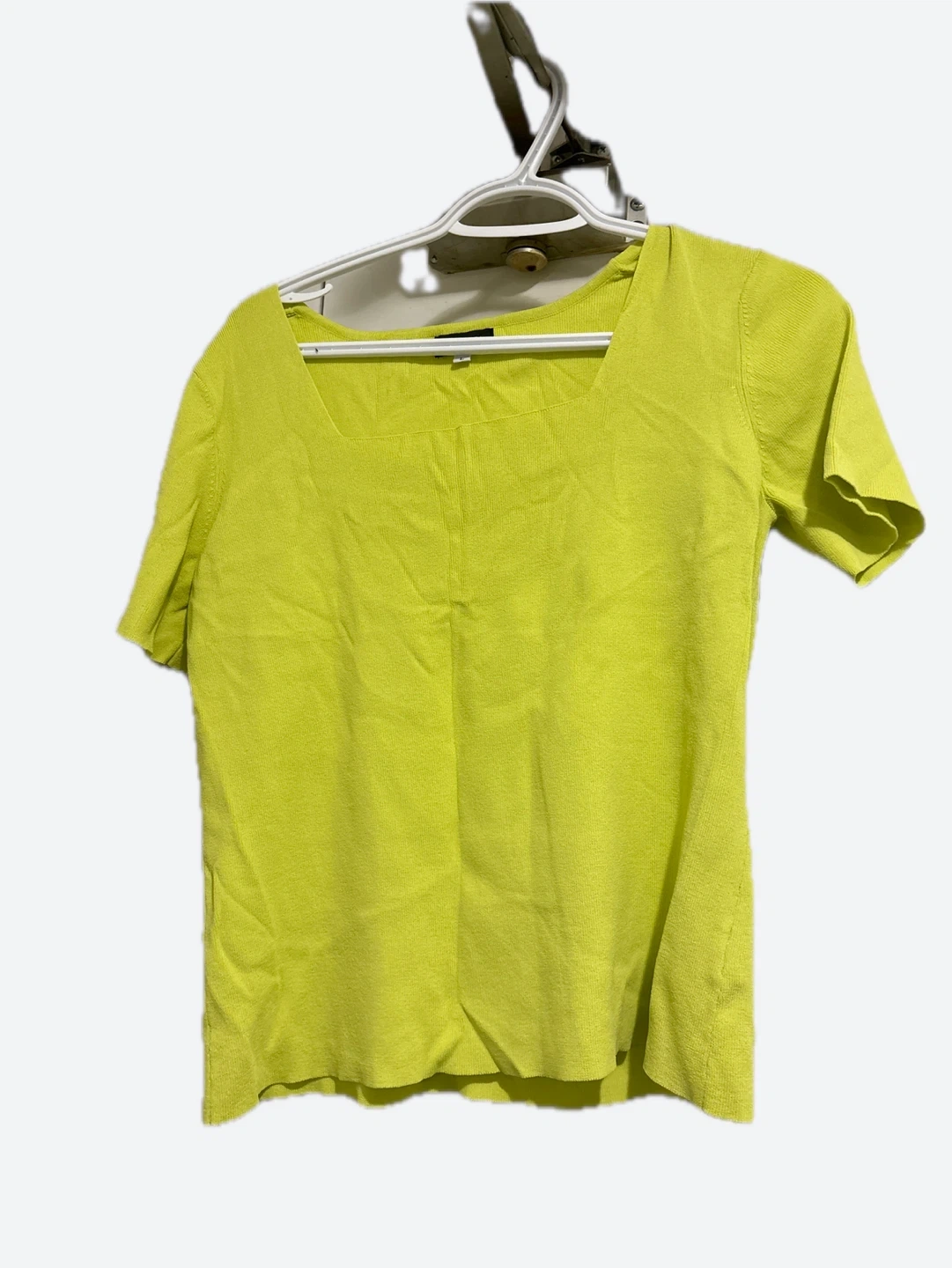 Selling a bright lime green knit top. It's in good condition and has a square neckline. Perfect for adding a pop of colour to your wardrobe!