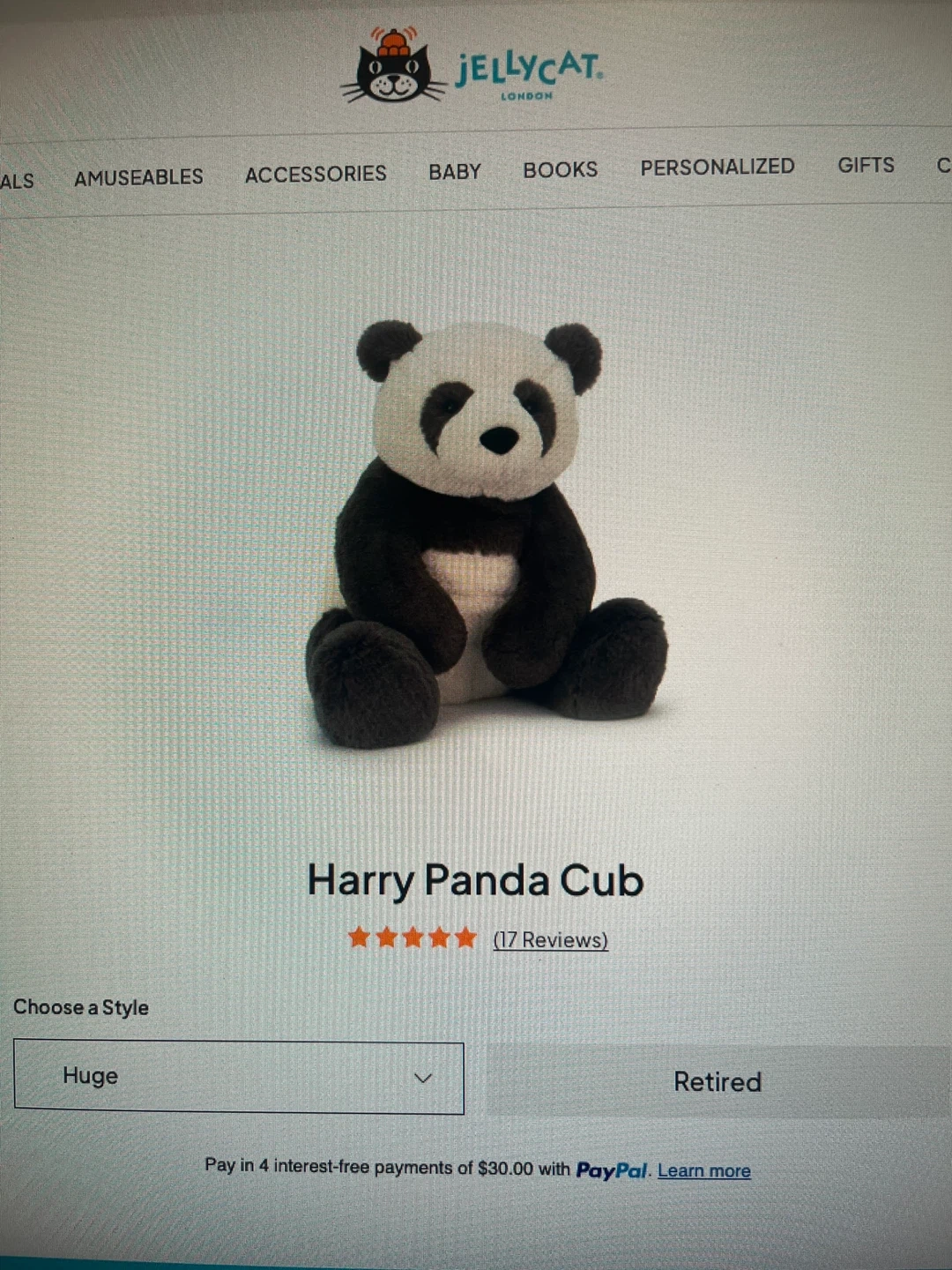 Selling a Jellycat Harry Panda Cub plushie. It's in great condition and not on the market anymore. Perfect cuddle size! Stored in closet and shielded from dust.