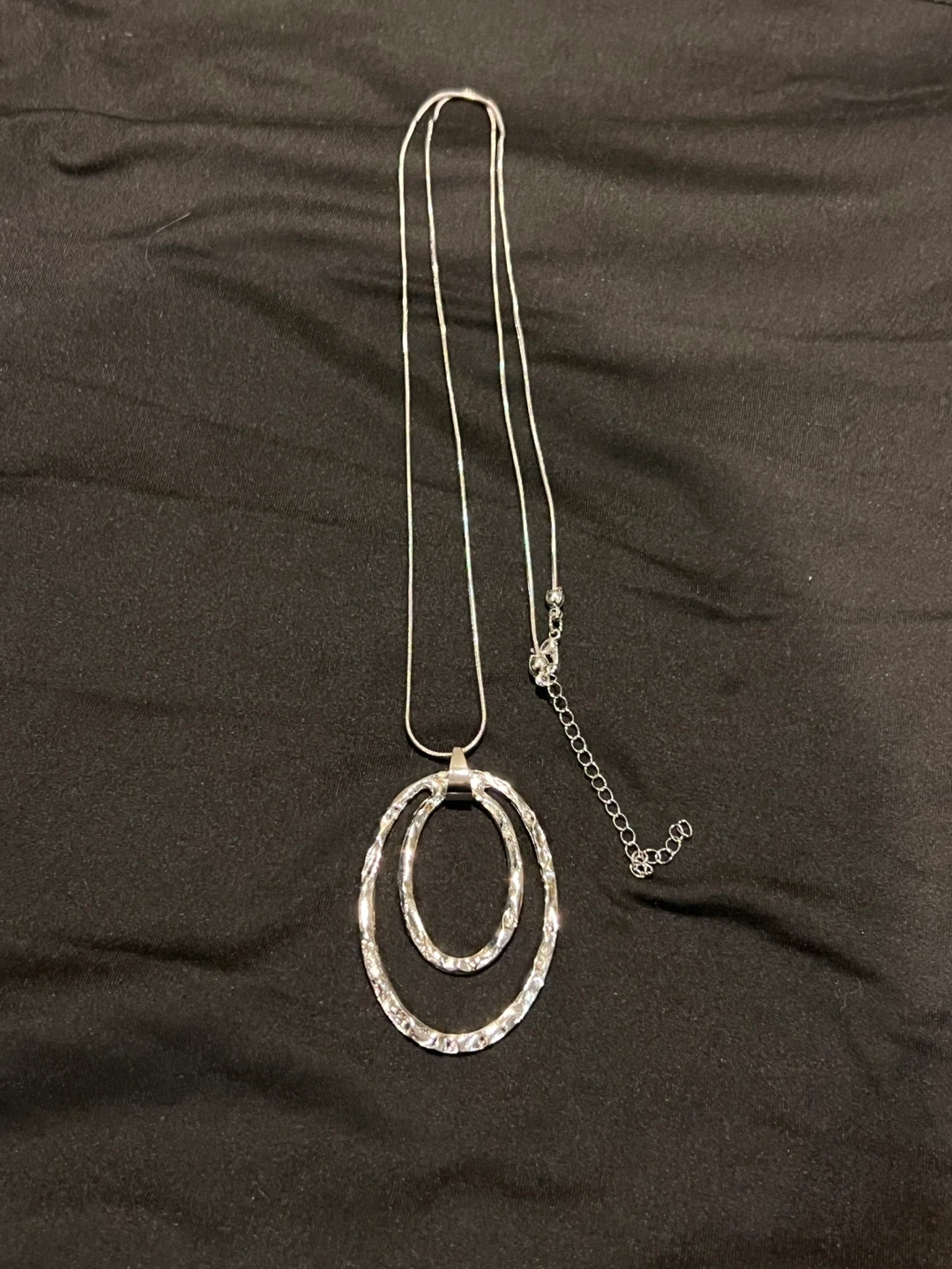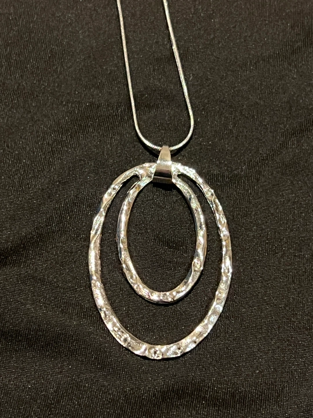 Selling a silver-tone necklace in great condition! It features a unique double oval pendant design. Perfect for adding a touch of elegance to any outfit