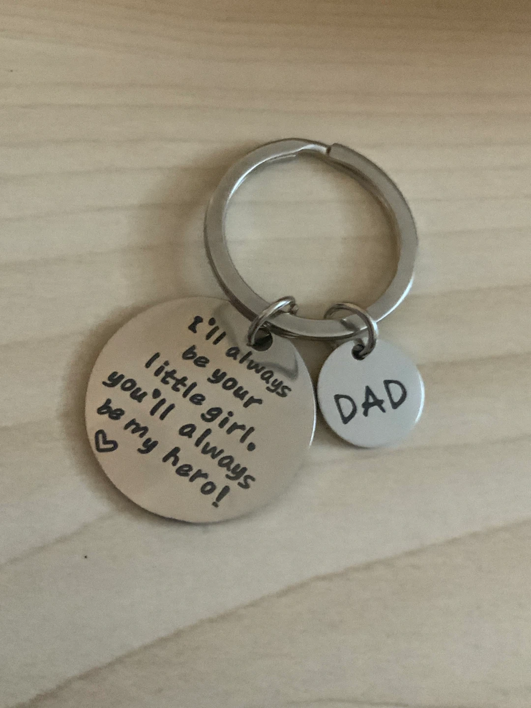 A sweet keychain with a heartfelt message. It says "I'll always be your little girl, you'll always be my hero!" and has a small charm that says "DAD". It's in great condition and would make a lovely gift!