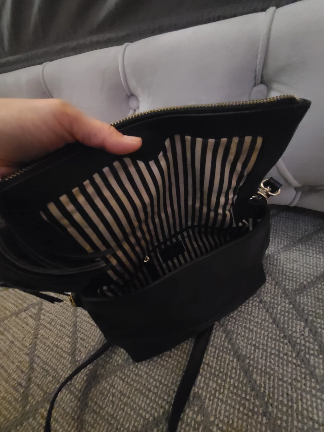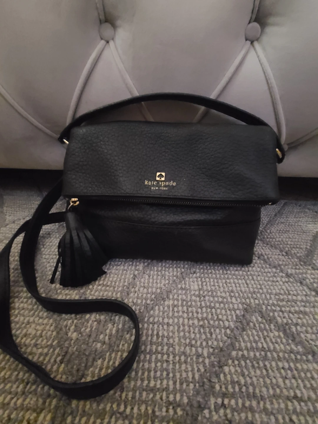 Selling a Kate Spade black leather crossbody bag! It's in great condition and ready for a new owner. The bag features a stylish tassel and a striped interior lining. Perfect for everyday use or a night out