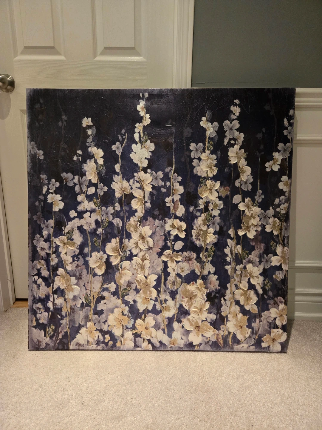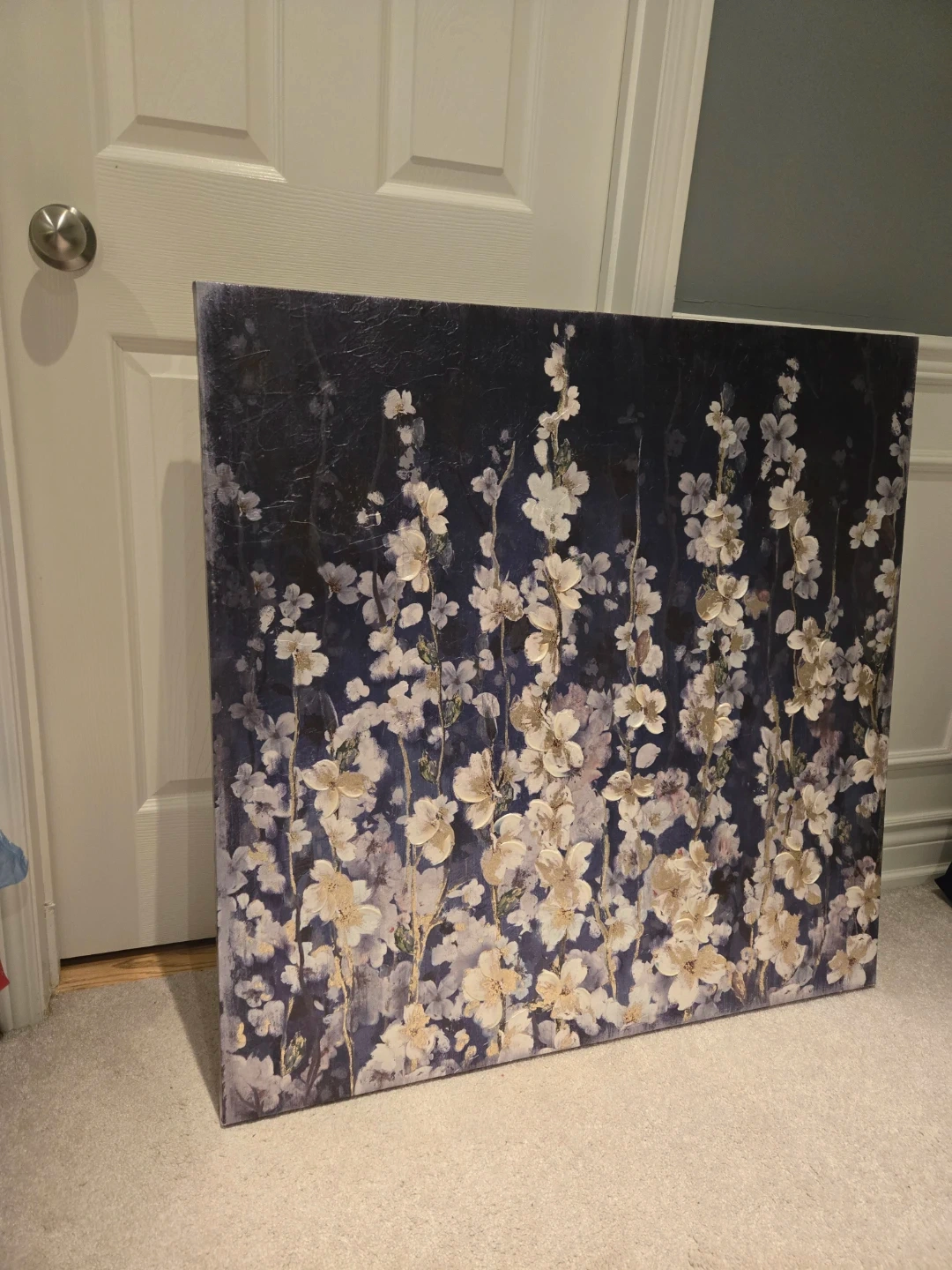 Selling a sophisticated large sized canvas floral wall painting in tones of navy blue, creamy white, Grey and pale gold. Size is 36" x 36". It's in great condition and would look beautiful in any room. The colours are soft and calming, perfect for adding a touch of elegance to your home decor!