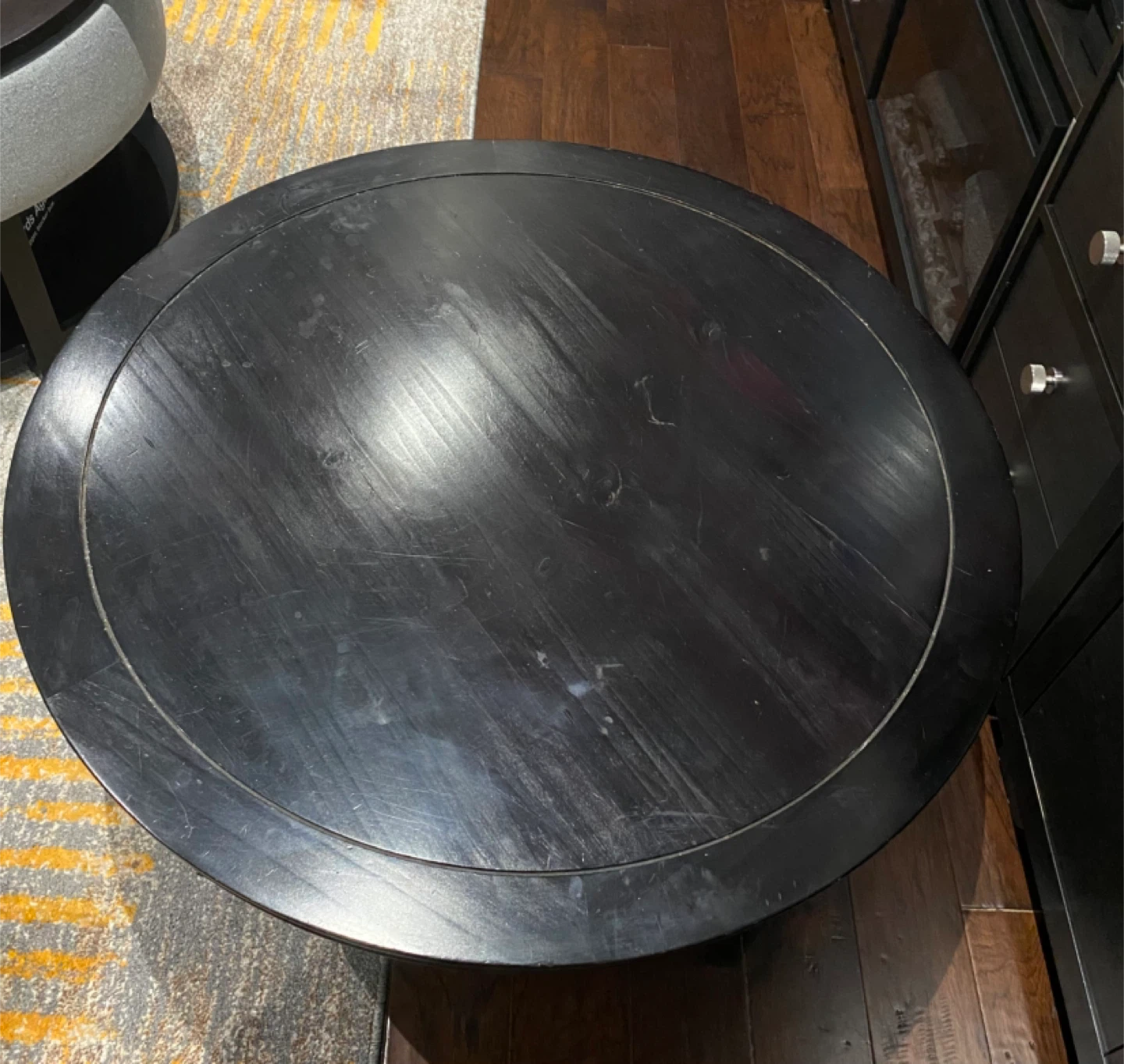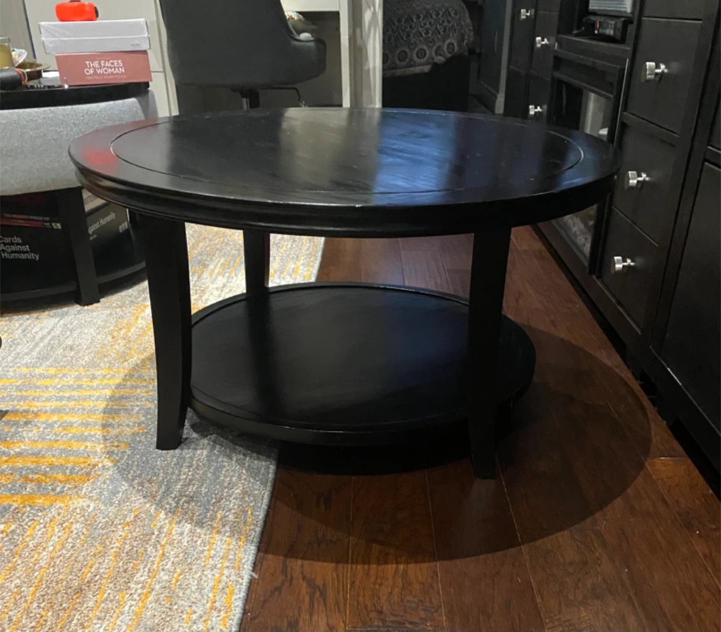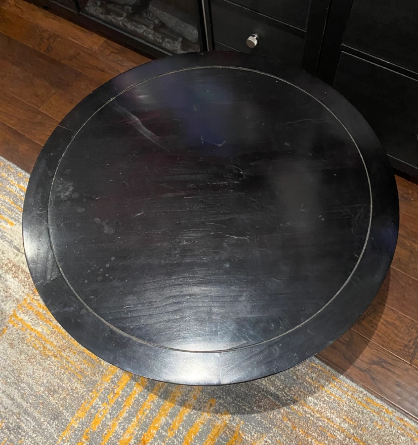 Selling a round wood coffee table in black-brown. It has a classic design with a lower shelf for extra storage or decor. Perfect for any living room! Measures 37” in diameter and 17-3/4” in height. Pick up at Weston and Eglinton.