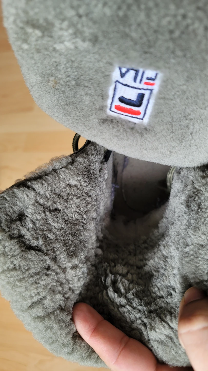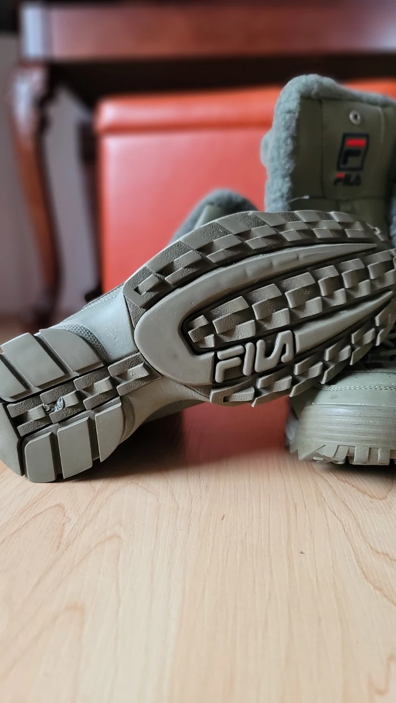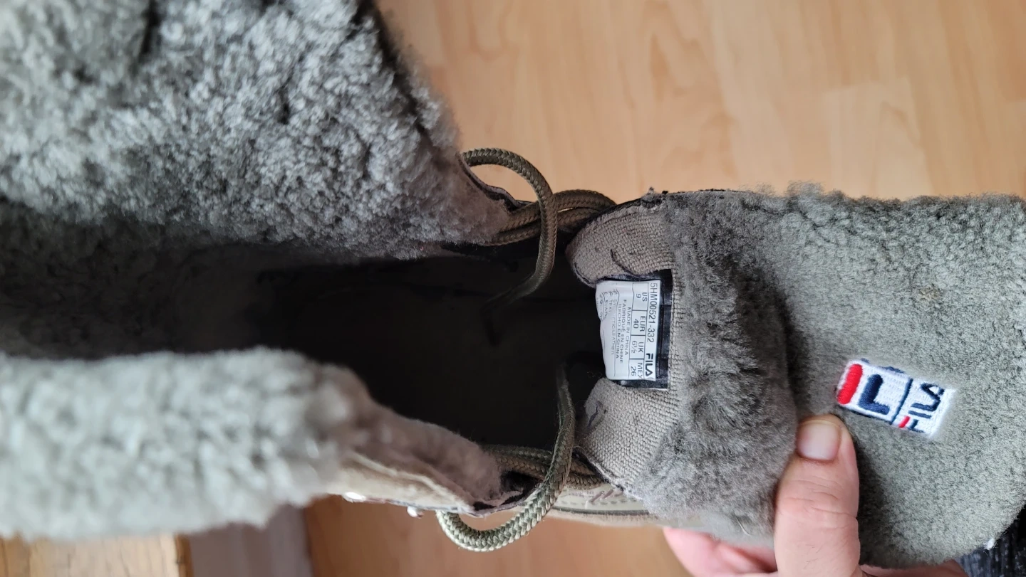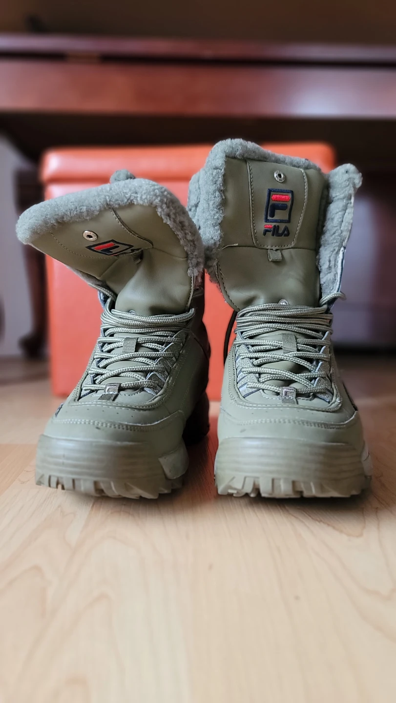 These Fila winter boots are perfect for keeping your feet warm and stylish this winter! They are olive green in colour and feature a cozy, furry lining. The size is a women's 9. They have some signs of wear but are still in good condition for hitting the snowy streets