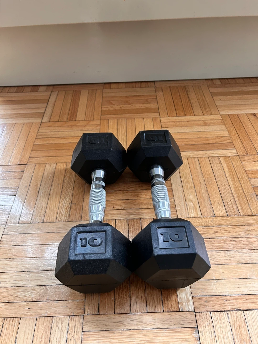 These are rubber-coated hex dumbbells, specifically a pair of 10 lb weights.