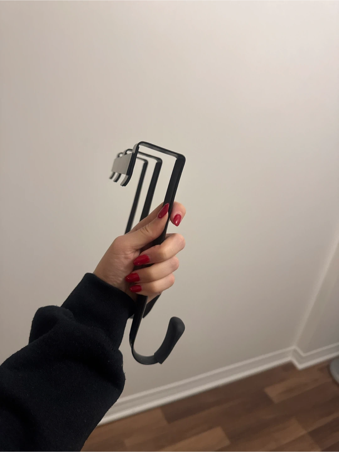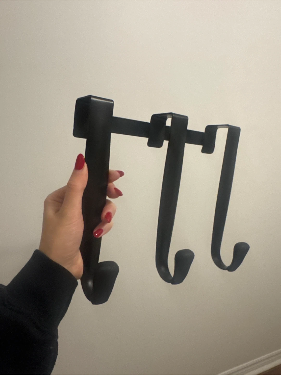 A black metal over-the-door hook hanger with three hooks. It's made of durable metal. This hanger easily fits over most doors for convenient storage!