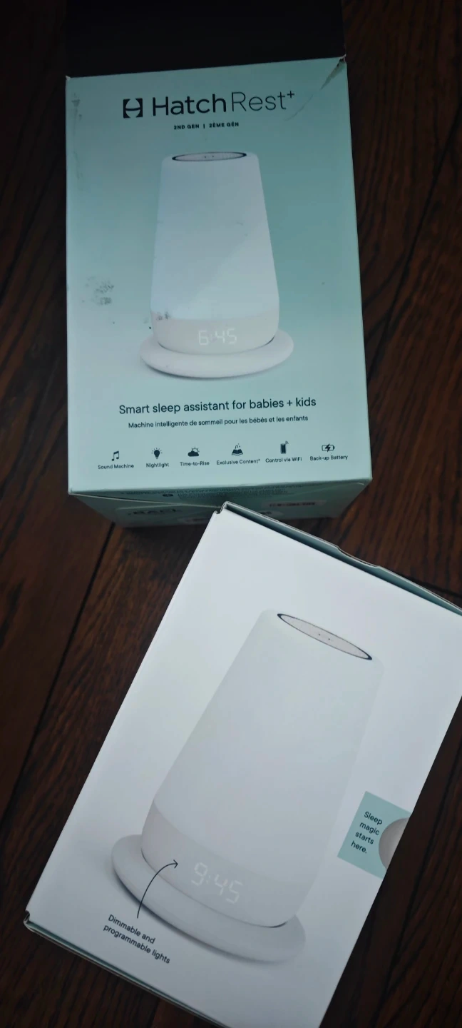 New Hatch Rest+ 2nd Generation for sale. This is the upgraded "Plus" model that features the portable charging base and a built-in backup battery, which is a lifesaver for keeping the white noise running during power outages or moving it between rooms for naps. It’s an all-in-one smart sound machine, night light, and time-to-rise clock that you can control entirely from your phone. Perfect for nurseries or toddlers, it has a huge library of soothing sounds and customizable light colors to help your little one sleep better. We received an extra one as a gift, so it’s never been used. From a smoke-free/pet-free home.