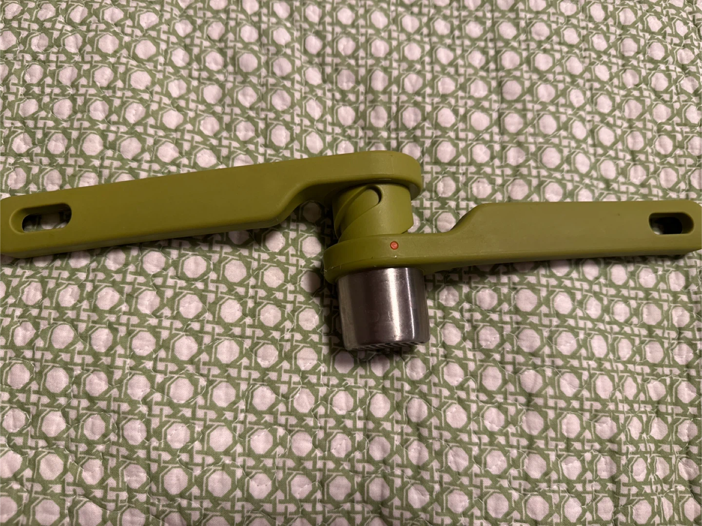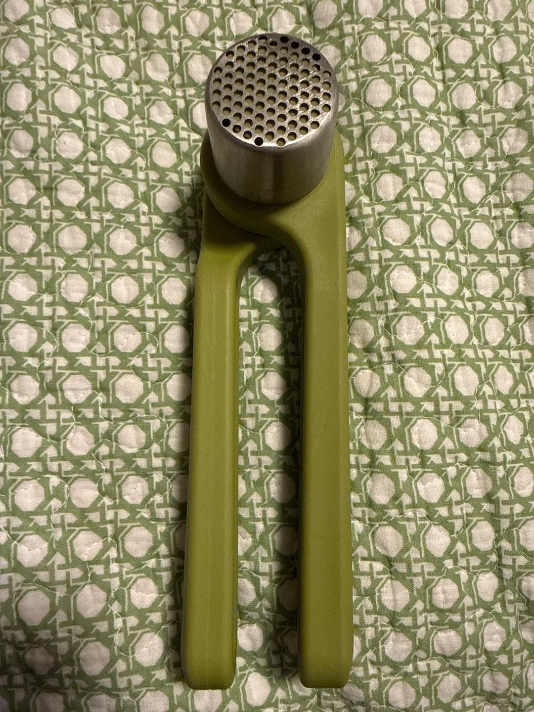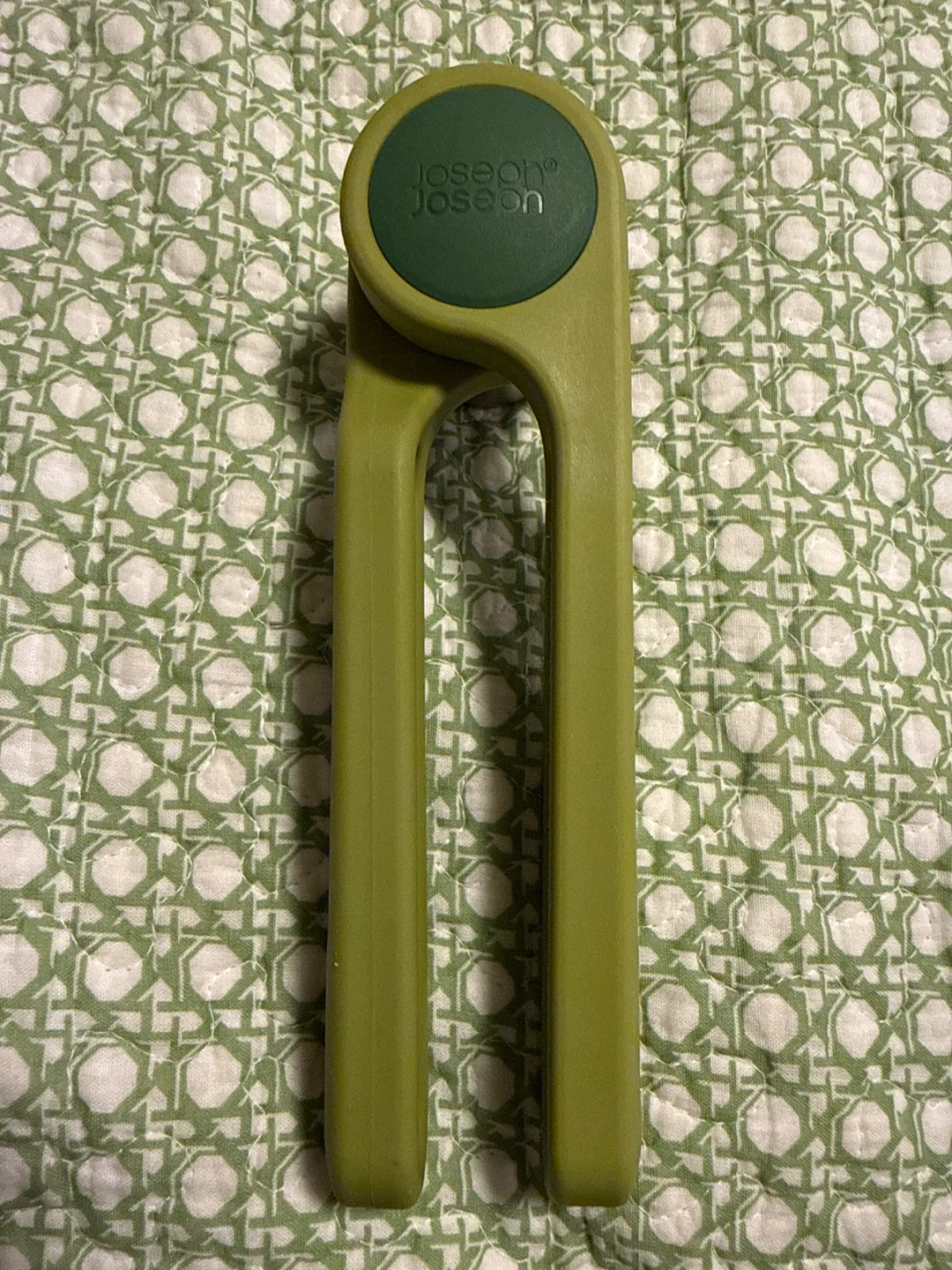 I'm selling a Joseph Joseph garlic press in green. It's in great condition and ready for a new kitchen! This garlic press is designed for easy use and cleaning, making it a handy tool for anyone with disabilities.