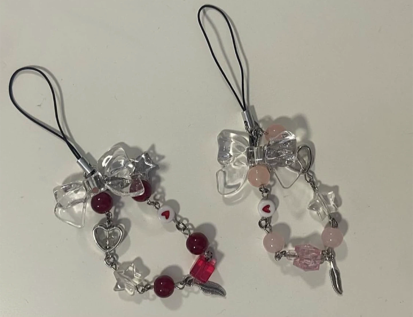 One is $5 start but depends on additions. Two adorable beaded phone charms! They feature clear bows, colourful beads in shades of pink and red, and cute charms like hearts and stars. Add a touch of whimsy to your phone with these handmade accessories
