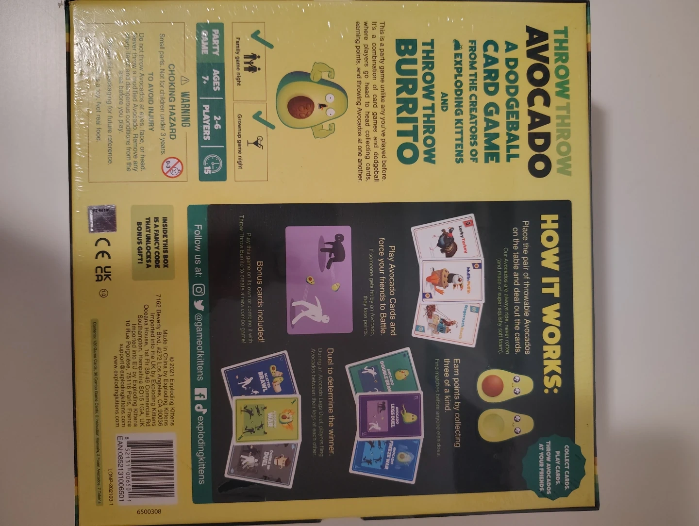 Selling the Throw Throw Avocado card game, a dodgeball card game from the creators of Exploding Kittens! It's a family-friendly game for 2-6 players, ages 7+. The box includes a pair of throwable avocados and bonus cards for a combo game