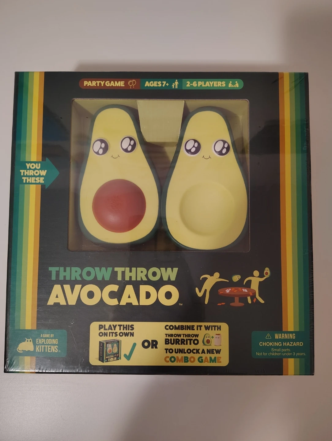 Selling the Throw Throw Avocado card game, a dodgeball card game from the creators of Exploding Kittens! It's a family-friendly game for 2-6 players, ages 7+. The box includes a pair of throwable avocados and bonus cards for a combo game